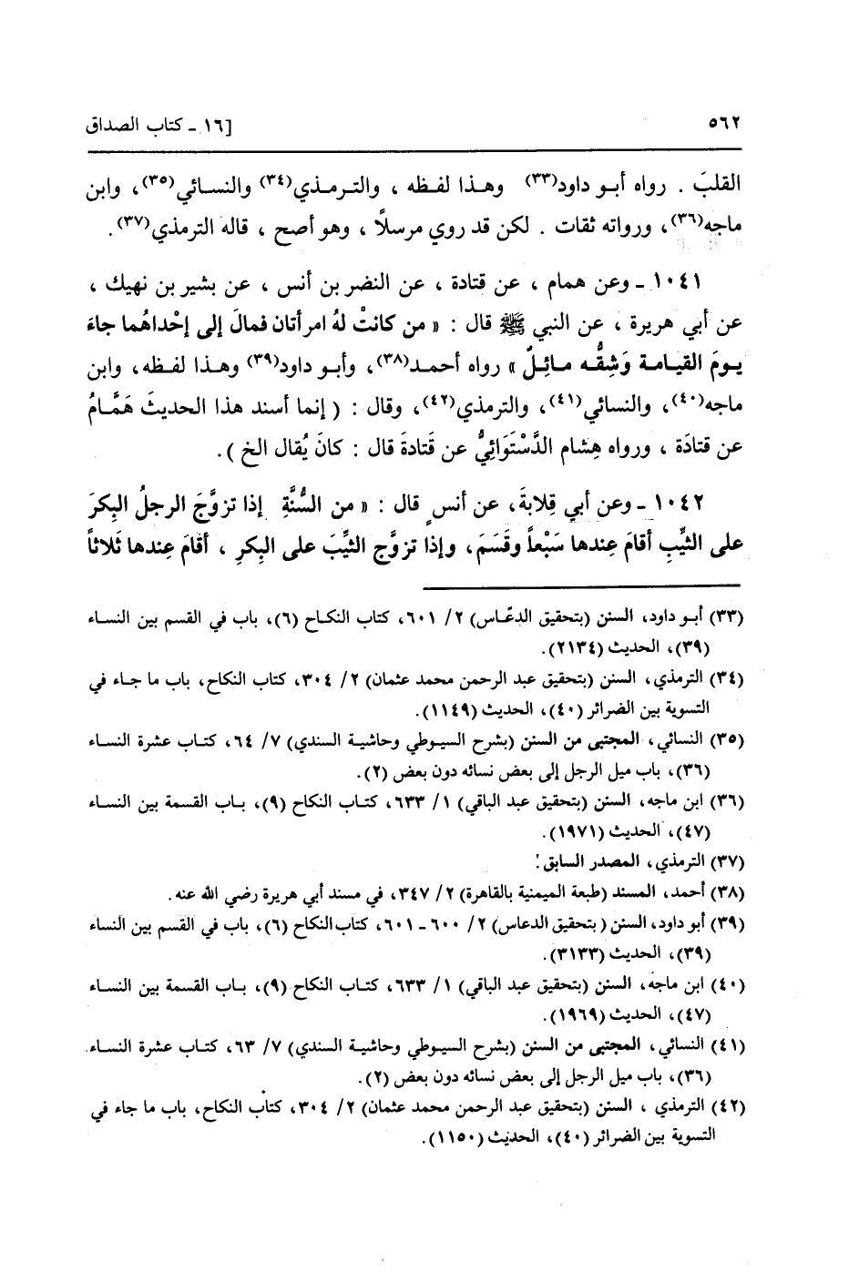 1046 - وَعَن عُرْوَة قَالَ: " قَالَت عَائِشَة: يَا ابْن أُخْتِي! كَانَ رَسُول الله صَلَّى اللَّهُ عَلَيْهِ وَسَلَّم َ لَا يفضل بَعْضهَا عَلَى بعض فِي الْقسم من مكثه عندنَا! وَكَانَ قل يَوْم إِلَّا وَهُوَ يطوف علينا فيدنو من كل امْرَأَة من غير مَسِيس حَتَّى يبلغ الَّتِي هُوَ يَوْمهَا فيبيت عِنْدهَا " رَوَاهُ أَحْمد، وَأَبُو دَاوُد وَهَذَا لَفظه، (وَإِسْنَاده جيد) .