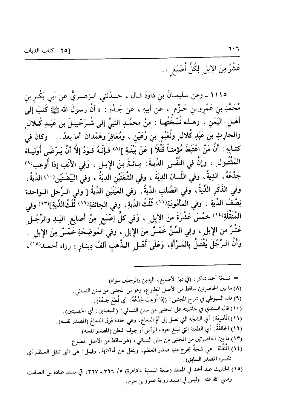 1118 - وَعنهُ قَالَ، قَالَ رَسُول الله صَلَّى اللَّهُ عَلَيْهِ وَسَلَّم َ: " عقل أهل الذِّمَّة نصف عقل الْمُسلمين، وهم الْيَهُود وَالنَّصَارَى " رَوَاهُ أَحْمد، وَابْن ماجة، وَالنَّسَائِيّ وَاللَّفْظ لَهُ، (وَالتِّرْمِذِيّ وَحسنه) . وَلأبي دَاوُد: " دِيَة الْمعَاهد نصف دِيَة الْحر ".