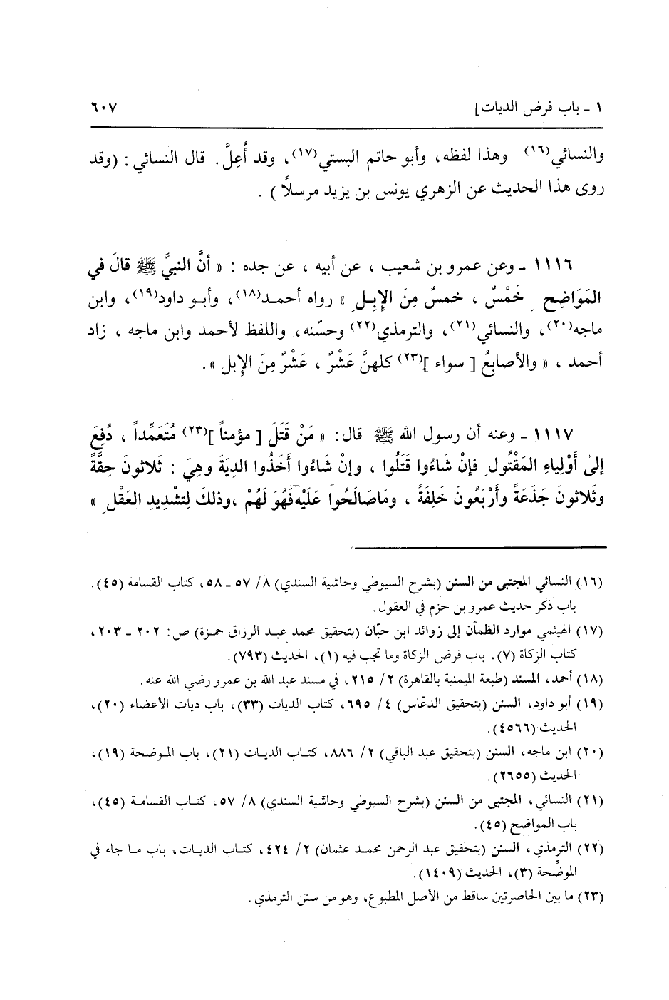 1121 - وَعَن عبد الله بن عَمْرو، عَن النَّبِي صَلَّى اللَّهُ عَلَيْهِ وَسَلَّم َ قَالَ: " قَتِيل الْخَطَأ شبه الْعمد: قَتِيل السَّوْط والعصا، فِيهِ مائَة من الْإِبِل، أَرْبَعُونَ مِنْهَا فِي بطونها أَوْلَادهَا " رَوَاهُ أَحْمد، وَأَبُو دَاوُد، وَابْن ماجة، وَالنَّسَائِيّ، وَفِي