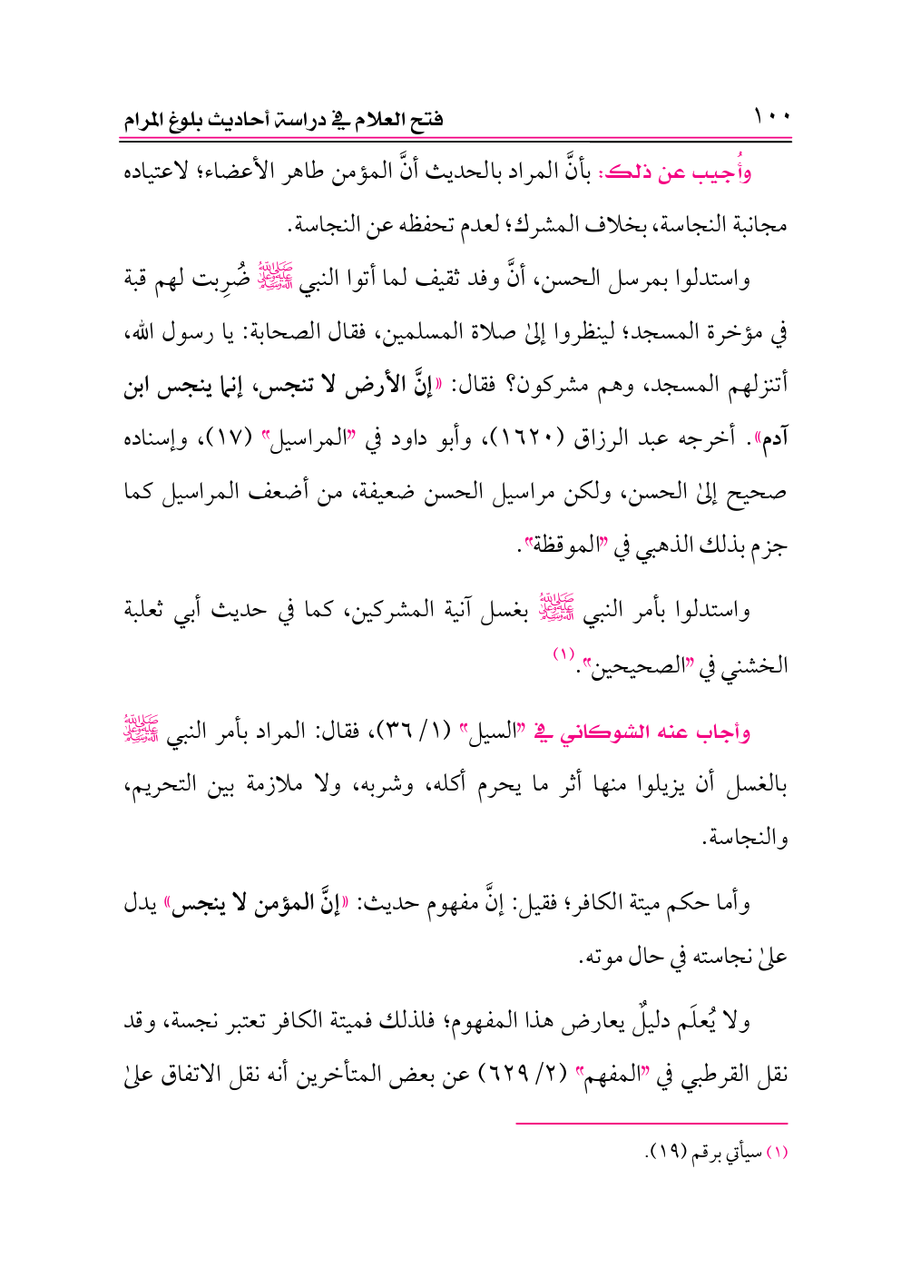 وأُجيب عن ذلك: بأنَّ المراد بالحديث أنَّ المؤمن طاهر الأعضاء؛ لاعتياده مجانبة النجاسة، بخلاف المشرك؛ لعدم تحفظه عن النجاسة.