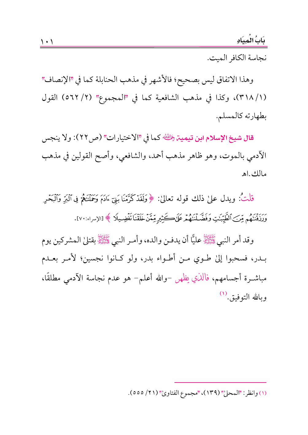 وقد أمر النبي -صلى الله عليه وعلى آله وسلم- عليًّا أن يدفن والده، وأمر النبي -صلى الله عليه وعلى آله وسلم- بقتلى المشركين يوم بدر، فسحبوا إلى طوي من أطواء بدر، ولو كانوا نجسين؛ لأمر بعدم مباشرة أجسامهم، فالذي يظهر -والله أعلم- هو عدم نجاسة الآدمي مطلقًا، وبالله التوفيق. (¬١)