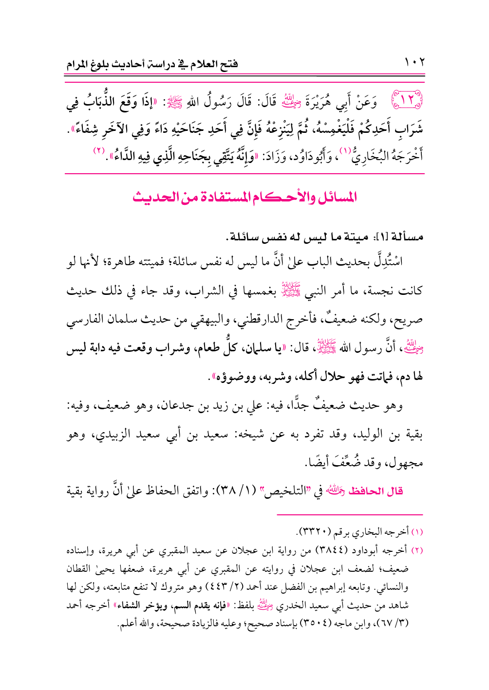 ١٢ - وَعَنْ أَبِي هُرَيْرَةَ -رضي الله عنه- قَالَ: قَالَ رَسُولُ اللهِ - صلى الله عليه وسلم -: «إذَا وَقَعَ الذُّبَابُ فِي شَرَابِ أَحَدِكُمْ فَلْيَغْمِسْهُ، ثُمَّ لِيَنْزِعْهُ فَإِنَّ فِي أَحَدِ جَنَاحَيْهِ دَاءً وَفِي الآخَرِ شِفَاءً». أَخْرَجَهُ البُخَارِيُّ (¬١)، وَأَبُودَاوُد، وَزَادَ: «وَإِنَّهُ يَتَّقِي بِجَنَاحِهِ الَّذِي فِيهِ الدَّاءُ». (¬٢)