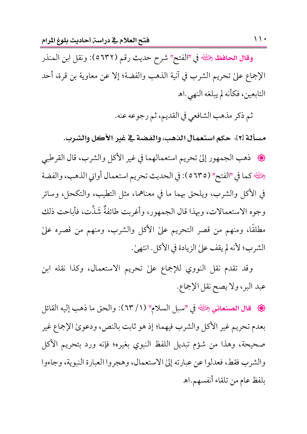• قال الصنعاني -رحمه الله- في «سبل السلام» (١/ ٦٣): والحق ما ذهب إليه القائل بعدم تحريم غير الأكل والشرب فيهما؛ إذ هو ثابت بالنص، ودعوى الإجماع غير صحيحة، وهذا من شؤم تبديل اللفظ النبوي بغيره؛ فإنه ورد بتحريم الأكل والشرب فقط، فعدلوا عن عبارته إلى الاستعمال، وهجروا العبارة النبوية، وجاءوا بلفظ عام من تلقاء أنفسهم. اهـ
