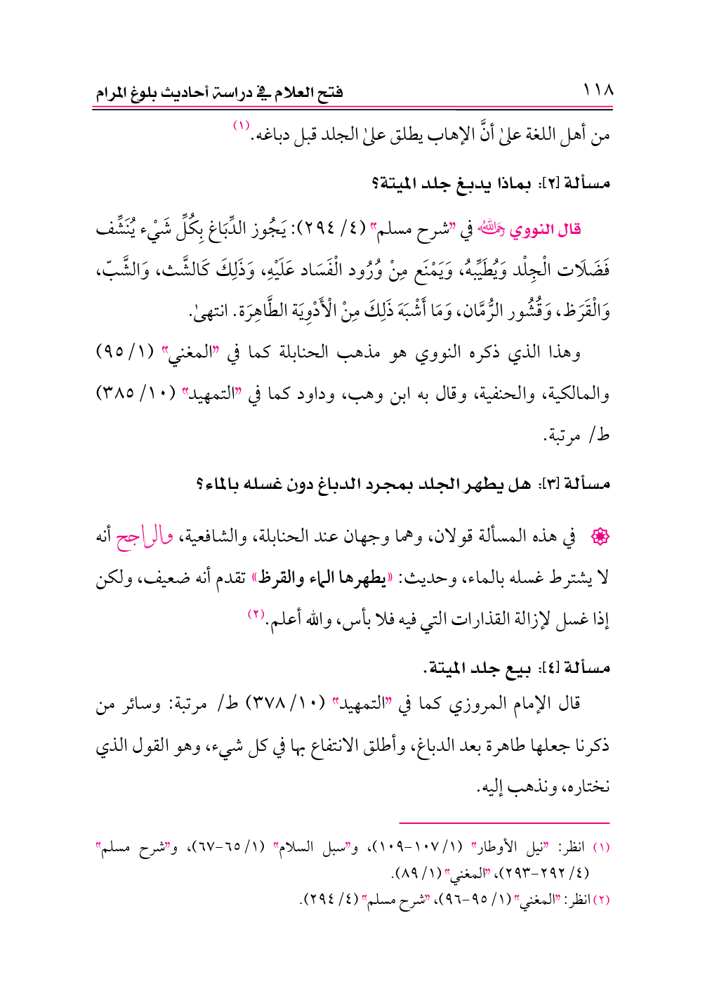 (¬١) انظر: «نيل الأوطار» (١/ ١٠٧ - ١٠٩)، و «سبل السلام» (١/ ٦٥ - ٦٧)، و «شرح مسلم» (٤/ ٢٩٢ - ٢٩٣)، «المغني» (١/ ٨٩).