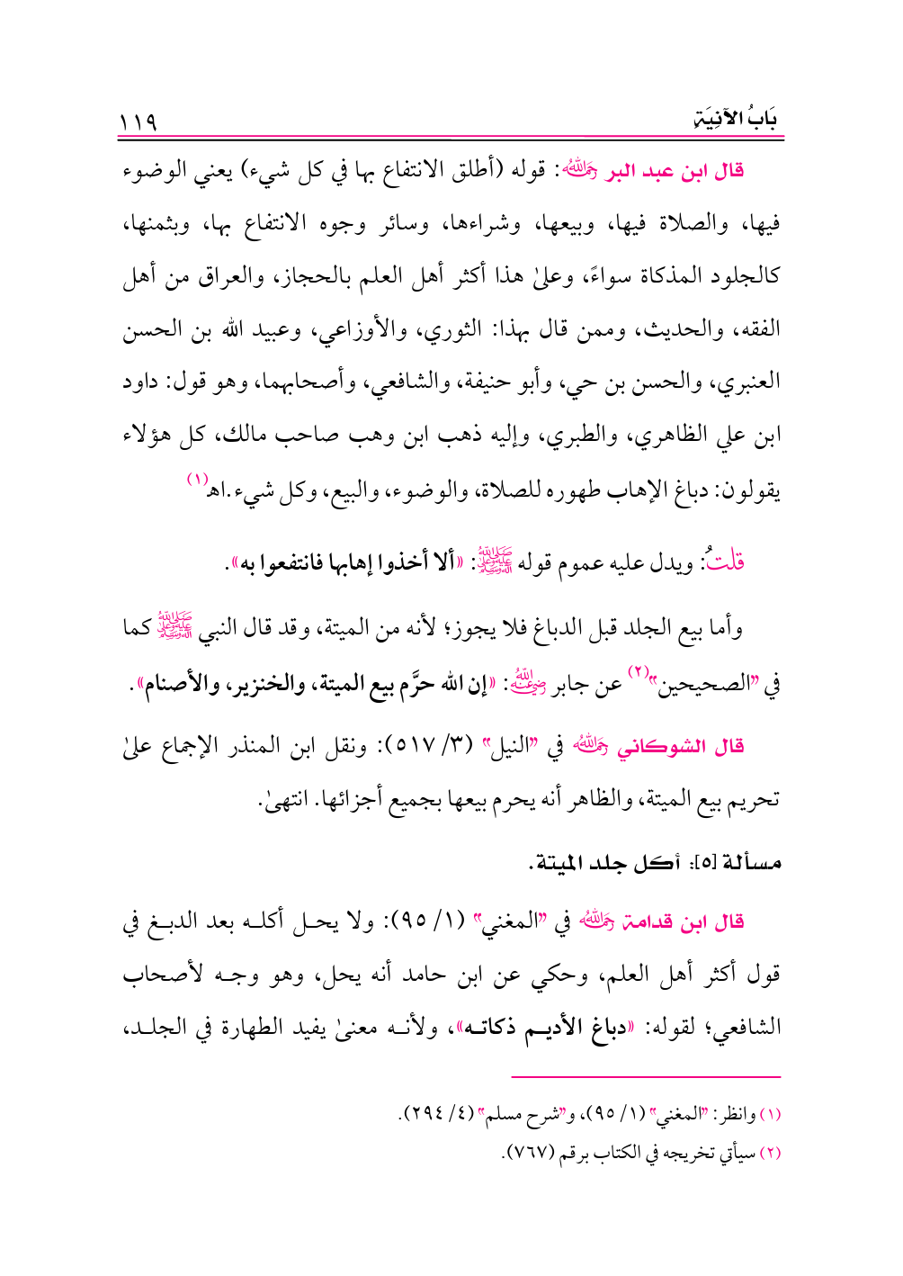 قال ابن عبد البر -رحمه الله-: قوله (أطلق الانتفاع بها في كل شيء) يعني الوضوء فيها، والصلاة فيها، وبيعها، وشراءها، وسائر وجوه الانتفاع بها، وبثمنها، كالجلود المذكاة سواءً، وعلى هذا أكثر أهل العلم بالحجاز، والعراق من أهل الفقه، والحديث، وممن قال بهذا: الثوري، والأوزاعي، وعبيد الله بن الحسن العنبري، والحسن بن حي، وأبو حنيفة، والشافعي، وأصحابهما، وهو قول: داود ابن علي الظاهري، والطبري، وإليه ذهب ابن وهب صاحب مالك، كل هؤلاء يقولون: دباغ الإهاب طهوره للصلاة، والوضوء، والبيع، وكل شيء. اهـ (¬١)