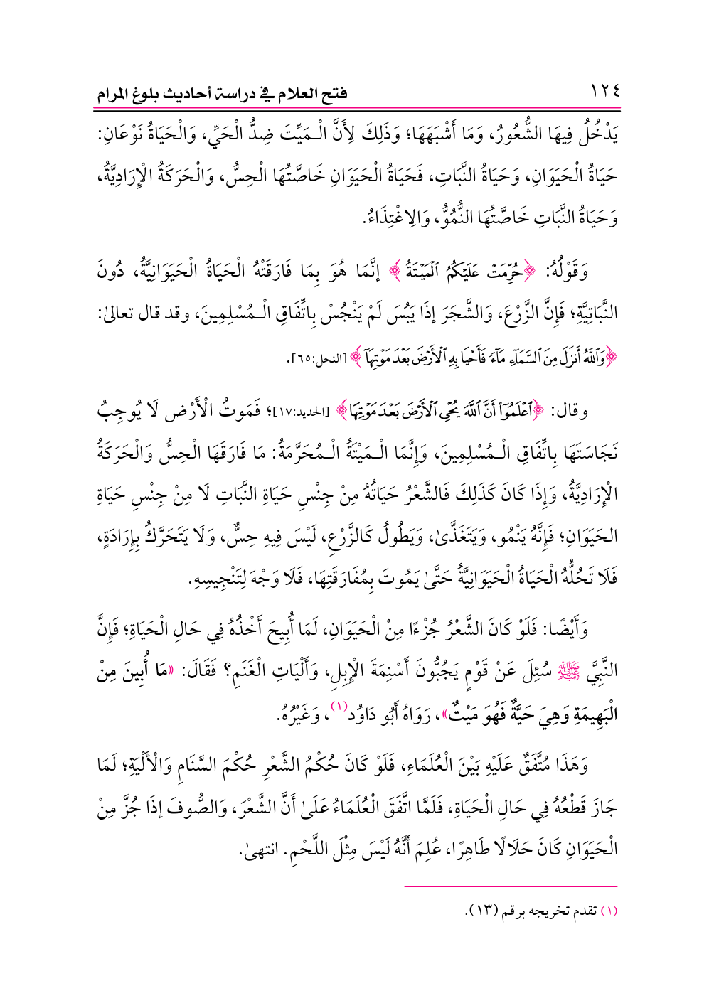 وَقَوْلُهُ: {حُرِّمَتْ عَلَيْكُمُ الْمَيْتَةُ} إنَّمَا هُوَ بِمَا فَارَقَتْهُ الْحَيَاةُ الْحَيَوَانِيَّةُ، دُونَ النَّبَاتِيَّةِ؛ فَإِنَّ الزَّرْعَ، وَالشَّجَرَ إذَا يَبُسَ لَمْ يَنْجُسْ بِاتِّفَاقِ الْمُسْلِمِينَ، وقد قال تعالى: {وَاللَّهُ أَنْزَلَ مِنَ السَّمَاءِ مَاءً فَأَحْيَا بِهِ الْأَرْضَ بَعْدَ مَوْتِهَا} [النحل:٦٥].