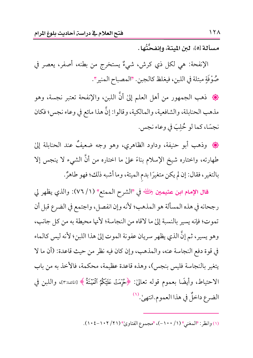 قال الإمام ابن عثيمين -رحمه الله- في «الشرح الممتع» (١/ ٧٦): والذي يظهر لي رجحانه في هذه المسألة هو المذهب؛ لأنه وإن انفصل، واجتمع في الضرع قبل أن تموت؛ فإنه يسير بالنسبة إلى ما لاقاه من النجاسة؛ لأنها محيطة به من كل جانب، وهو يسير، ثم إنَّ الذي يظهر سريان عفونة الموت إلى هذا اللبن؛ لأنه ليس كالماء في قوة دفع النجاسة عنه، والمذهب، وإن كان فيه نظر من حيث قاعدة: (أن ما لا يتغير بالنجاسة فليس بنجس)، وهذه قاعدة عظيمة، محكمة، فالأخذ به من باب الاحتياط، وأيضًا بعموم قوله تعالى: {حُرِّمَتْ عَلَيْكُمُ الْمَيْتَةُ} [المائدة:٣]، واللبن في الضرع داخلٌ في هذا العموم. انتهى. (¬١)