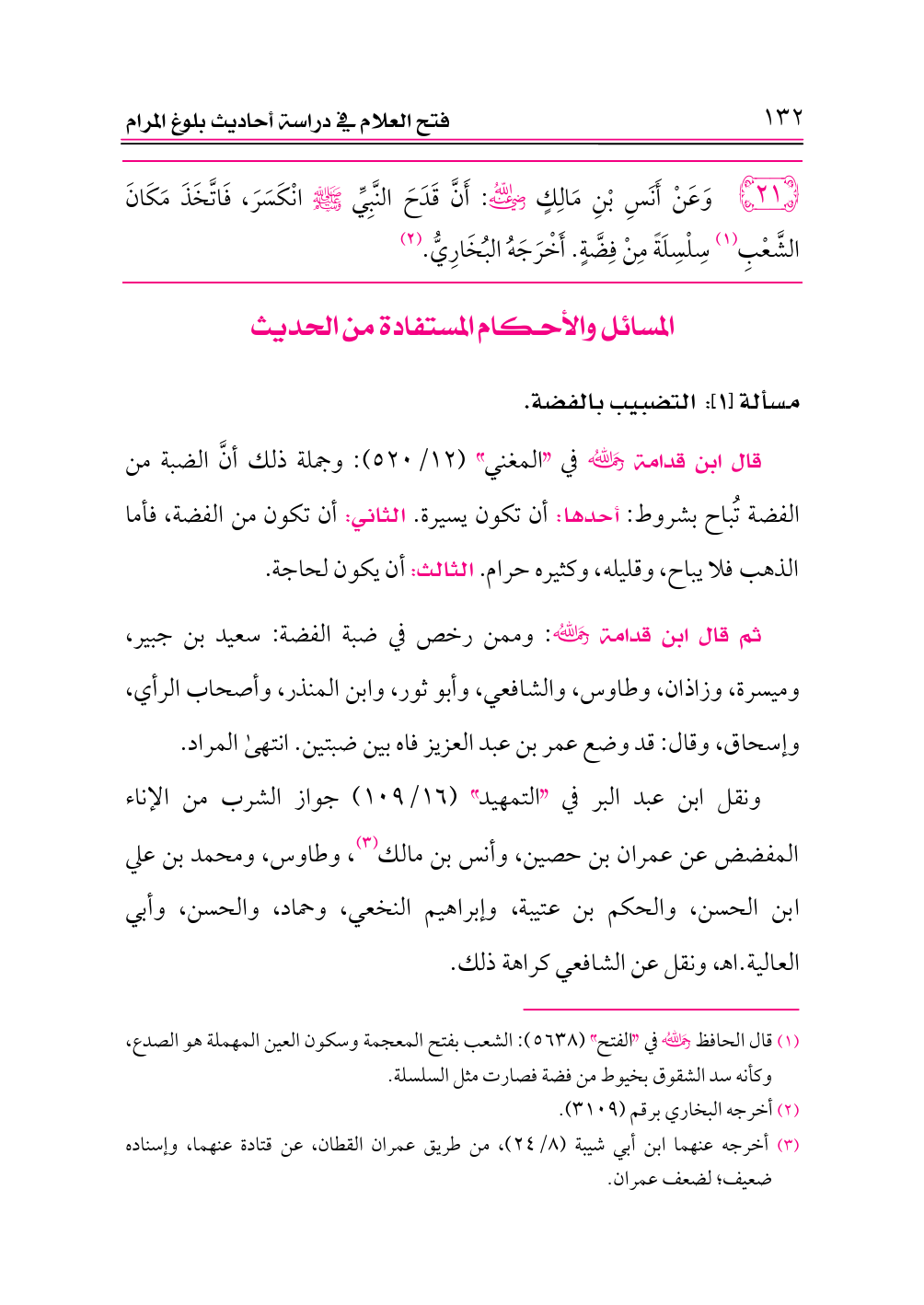 ٢١ - وَعَنْ أَنَسِ بْنِ مَالِكٍ -رضي الله عنه-: أَنَّ قَدَحَ النَّبِيِّ - صلى الله عليه وسلم - انْكَسَرَ، فَاتَّخَذَ مَكَانَ الشَّعْبِ (¬١) سِلْسِلَةً مِنْ فِضَّةٍ. أَخْرَجَهُ البُخَارِيُّ. (¬٢)