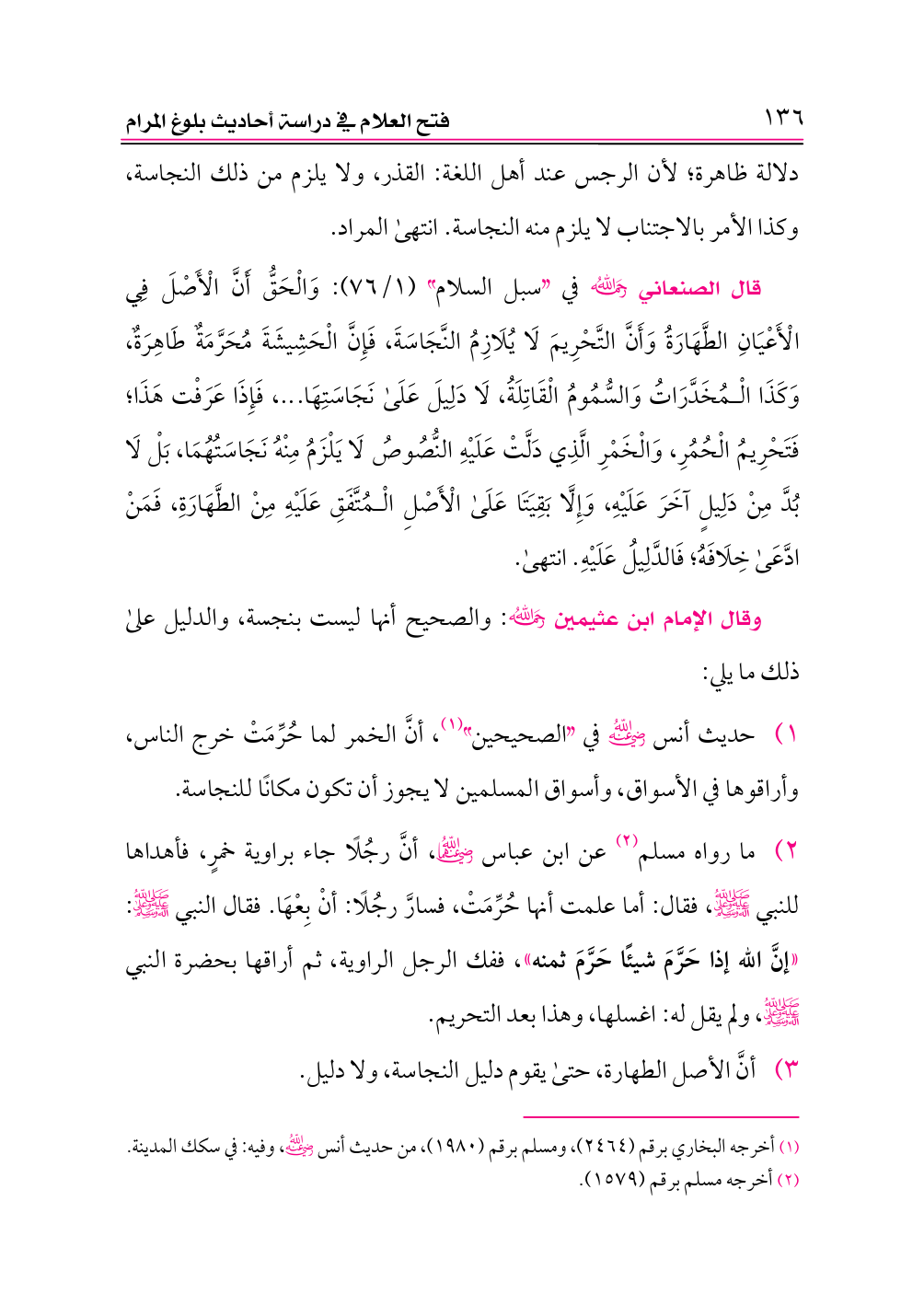 قال الصنعاني -رحمه الله- في «سبل السلام» (١/ ٧٦): وَالْحَقُّ أَنَّ الْأَصْلَ فِي الْأَعْيَانِ الطَّهَارَةُ وَأَنَّ التَّحْرِيمَ لَا يُلَازِمُ النَّجَاسَةَ، فَإِنَّ الْحَشِيشَةَ مُحَرَّمَةٌ طَاهِرَةٌ، وَكَذَا الْمُخَدَّرَاتُ وَالسُّمُومُ الْقَاتِلَةُ، لَا دَلِيلَ عَلَى نَجَاسَتِهَا ... ، فَإِذَا عَرَفْت هَذَا؛ فَتَحْرِيمُ الْحُمُرِ، وَالْخَمْرِ الَّذِي دَلَّتْ عَلَيْهِ النُّصُوصُ لَا يَلْزَمُ مِنْهُ نَجَاسَتُهُمَا، بَلْ لَا بُدَّ مِنْ دَلِيلٍ آخَرَ عَلَيْهِ، وَإِلَّا بَقِيَتَا عَلَى الْأَصْلِ الْمُتَّفَقِ عَلَيْهِ مِنْ الطَّهَارَةِ، فَمَنْ ادَّعَى خِلَافَهُ؛ فَالدَّلِيلُ عَلَيْهِ. انتهى.