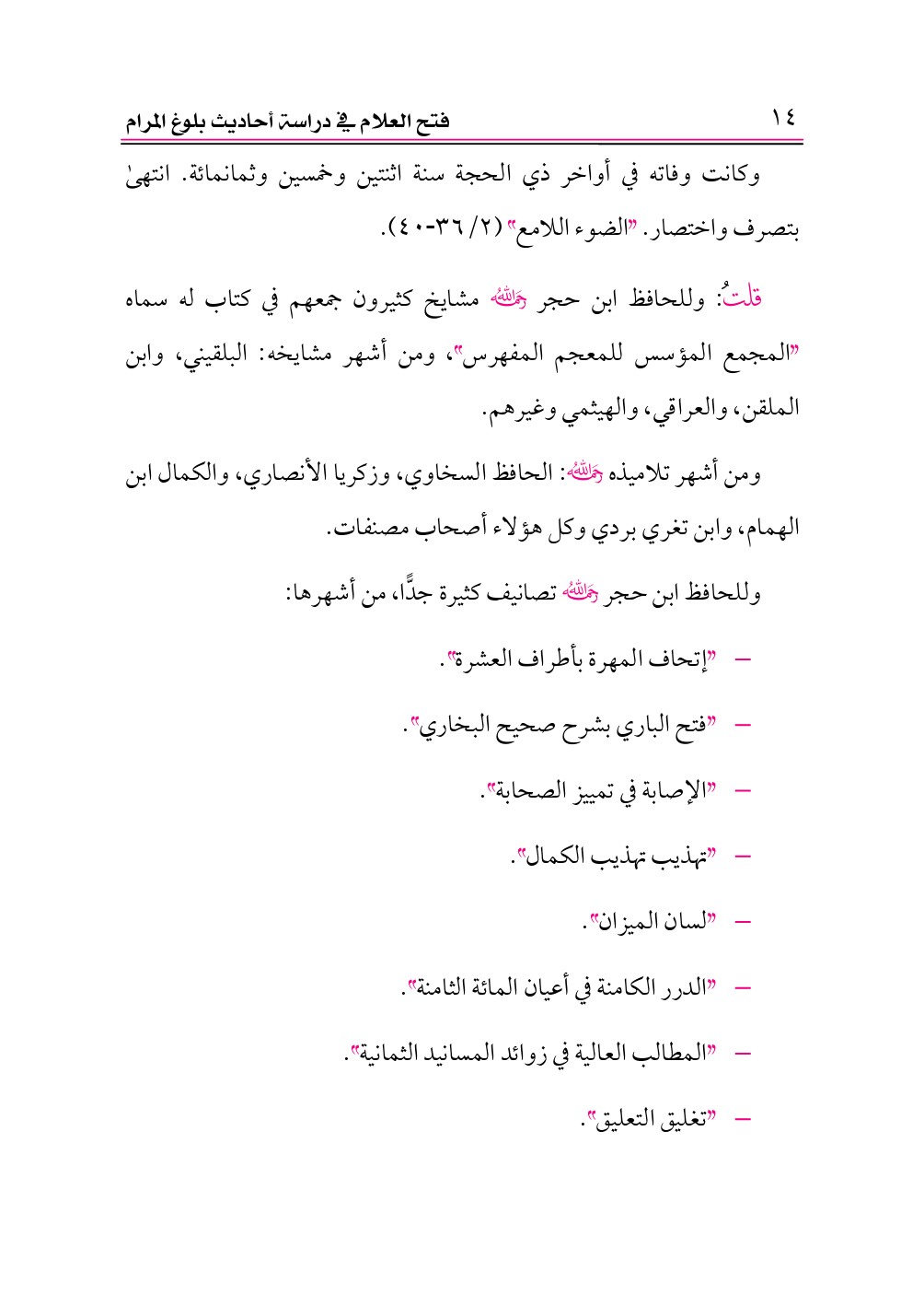 قلتُ: وللحافظ ابن حجر -رحمه الله- مشايخ كثيرون جمعهم في كتاب له سماه «المجمع المؤسس للمعجم المفهرس»، ومن أشهر مشايخه: البلقيني، وابن الملقن، والعراقي، والهيثمي وغيرهم.