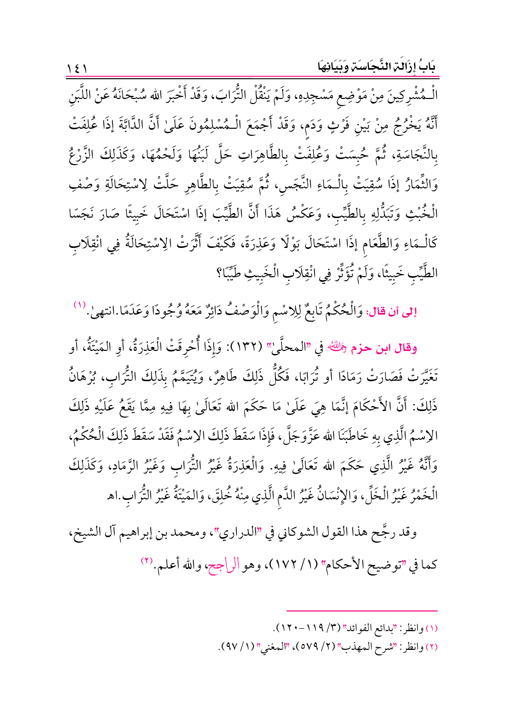 وقال ابن حزم -رحمه الله- في «المحلَّى» (١٣٢): وَإِذَا أُحْرِقَتْ الْعَذِرَةُ، أوِ المَيْتَةُ، أو تَغَيَّرَتْ فَصَارَتْ رَمَادًا أو تُرَابًا، فَكُلُّ ذَلِكَ طَاهِرٌ، وَيُتَيَمَّمُ بِذَلِكَ التُّرَابِ، بُرْهَانُ ذَلِكَ: أَنَّ الأَحْكَامَ إنَّمَا هِيَ عَلَى مَا حَكَمَ الله تَعَالَى بِهَا فِيهِ مِمَّا يَقَعُ عَلَيْهِ ذَلِكَ الاِسْمُ الَّذِي بِهِ خَاطَبَنَا الله عَزَّوَجَلَّ، فَإِذَا سَقَطَ ذَلِكَ الاِسْمُ فَقَدْ سَقَطَ ذَلِكَ الْحُكْمُ، وَأَنَّهُ غَيْرُ الَّذِي حَكَمَ الله تَعَالَى فِيهِ. وَالْعَذِرَةُ غَيْرُ التُّرَابِ وَغَيْرُ الرَّمَادِ، وَكَذَلِكَ الْخَمْرُ غَيْرُ الْخَلِّ، وَالإِنْسَانُ غَيْرُ الدَّمِ الَّذِي مِنْهُ خُلِقَ، وَالمَيْتَةُ غَيْرُ التُّرَابِ. اهـ