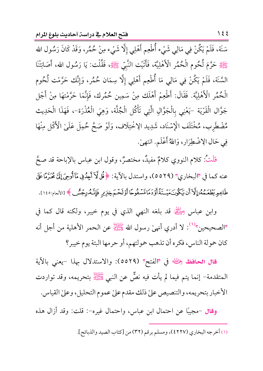 قلتُ: كلام النووي كلامٌ مفيدٌ، مختصرٌ، وقول ابن عباس بالإباحة قد صحَّ عنه كما في «البخاري» (٥٥٢٩)، واستدل بالآية: {قُلْ لَا أَجِدُ فِي مَا أُوحِيَ إِلَيَّ مُحَرَّمًا عَلَى طَاعِمٍ يَطْعَمُهُ إِلَّا أَنْ يَكُونَ مَيْتَةً أَوْ دَمًا مَسْفُوحًا أَوْ لَحْمَ خِنْزِيرٍ فَإِنَّهُ رِجْسٌ} [الأنعام:١٤٥].