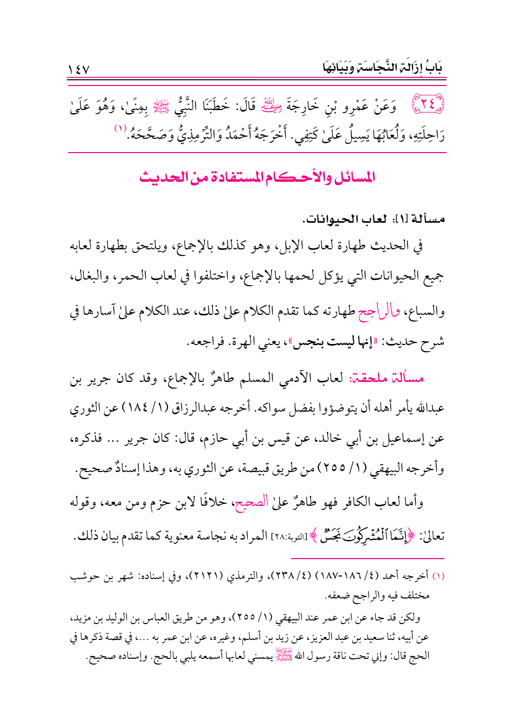 ٢٤ - وَعَنْ عَمْرِو بْنِ خَارِجَةَ -رضي الله عنه- قَالَ: خَطَبَنَا النَّبِيُّ - صلى الله عليه وسلم - بِمِنًى، وَهُوَ عَلَى رَاحِلَتِهِ، وَلُعَابُهَا يَسِيلُ عَلَى كَتِفِي. أَخْرَجَهُ أَحْمَدُ وَالتِّرْمِذِيُّ وَصَحَّحَهُ. (¬١)