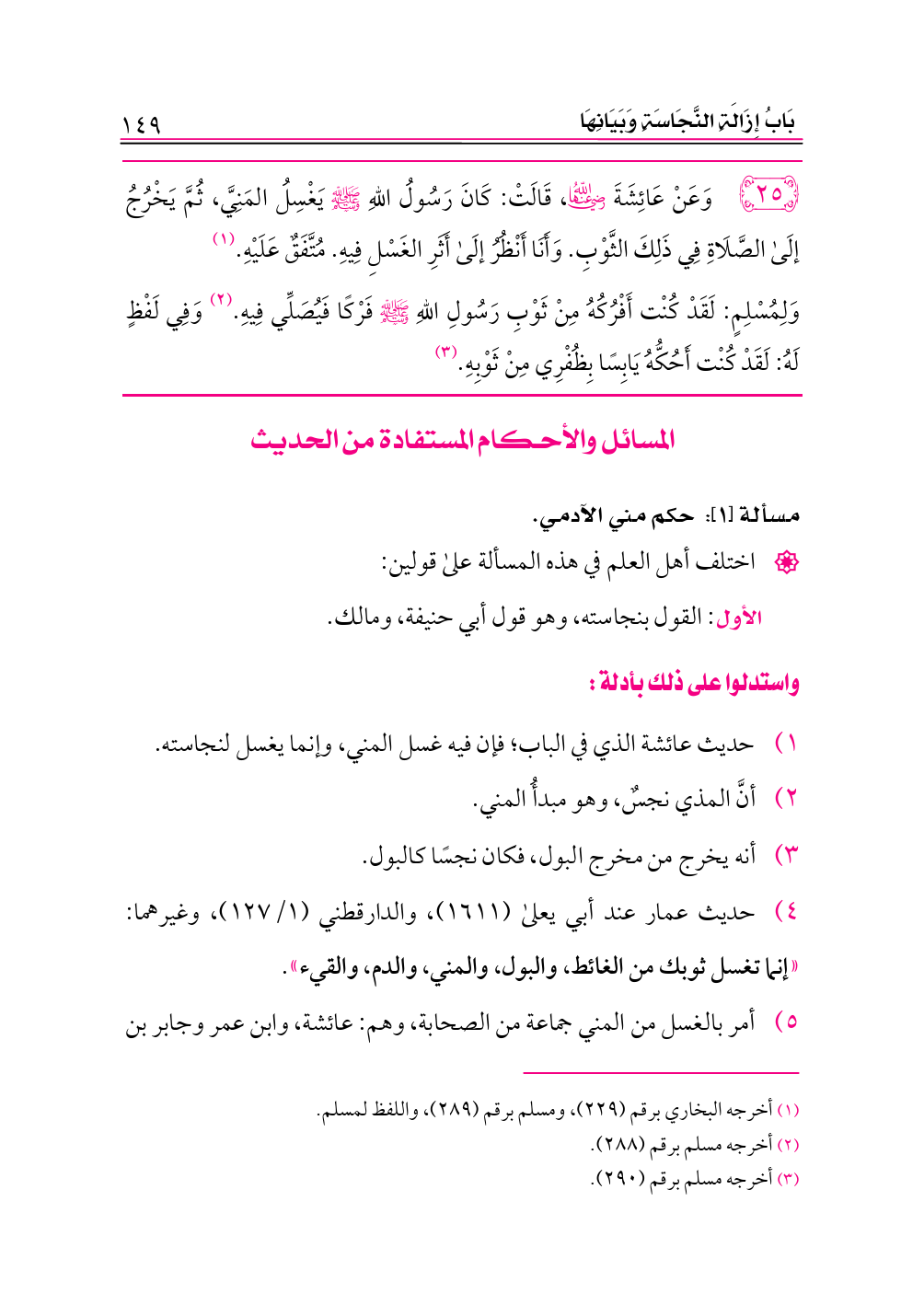 ٢٥ - وَعَنْ عَائِشَةَ -رضي الله عنها-، قَالَتْ: كَانَ رَسُولُ اللهِ - صلى الله عليه وسلم - يَغْسِلُ المَنِيَّ، ثُمَّ يَخْرُجُ إلَى الصَّلَاةِ فِي ذَلِكَ الثَّوْبِ. وَأَنَا أَنْظُرُ إلَى أَثَرِ الغَسْلِ فِيهِ. مُتَّفَقٌ عَلَيْهِ. (¬١)