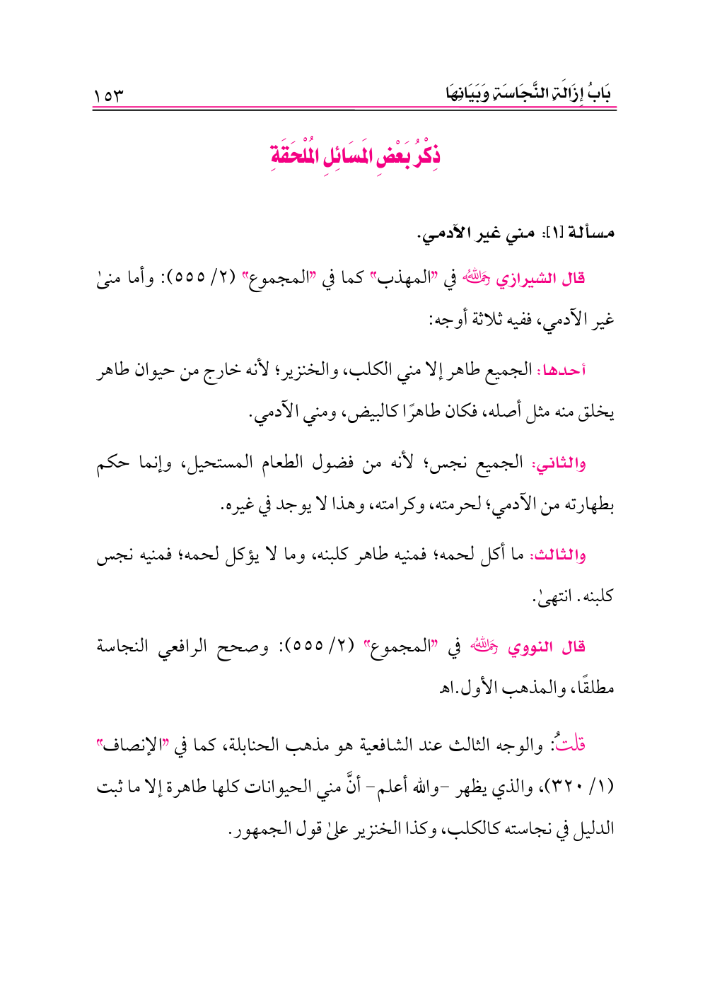 قلتُ: والوجه الثالث عند الشافعية هو مذهب الحنابلة، كما في «الإنصاف» (١/ ٣٢٠)، والذي يظهر -والله أعلم- أنَّ مني الحيوانات كلها طاهرة إلا ما ثبت الدليل في نجاسته كالكلب، وكذا الخنزير على قول الجمهور.