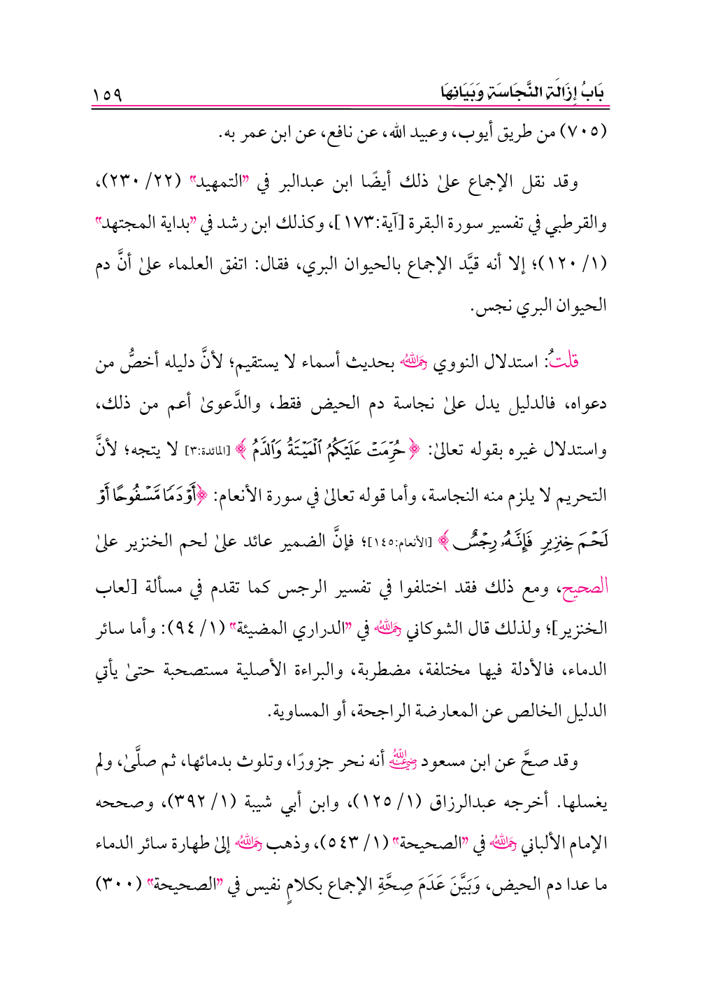 قلتُ: استدلال النووي -رحمه الله- بحديث أسماء لا يستقيم؛ لأنَّ دليله أخصُّ من دعواه، فالدليل يدل على نجاسة دم الحيض فقط، والدَّعوى أعم من ذلك، واستدلال غيره بقوله تعالى: {حُرِّمَتْ عَلَيْكُمُ الْمَيْتَةُ وَالدَّمُ} [المائدة:٣] لا يتجه؛ لأنَّ التحريم لا يلزم منه النجاسة، وأما قوله تعالى في سورة الأنعام: {أَوْ دَمًا مَسْفُوحًا أَوْ لَحْمَ خِنْزِيرٍ فَإِنَّهُ رِجْسٌ} [الأنعام:١٤٥]؛ فإنَّ الضمير عائد على لحم الخنزير على الصحيح، ومع ذلك فقد اختلفوا في تفسير الرجس كما تقدم في مسألة [لعاب الخنزير]؛ ولذلك قال الشوكاني -رحمه الله- في «الدراري المضيئة» (١/ ٩٤): وأما سائر الدماء، فالأدلة فيها مختلفة، مضطربة، والبراءة الأصلية مستصحبة حتى يأتي الدليل الخالص عن المعارضة الراجحة، أو المساوية.