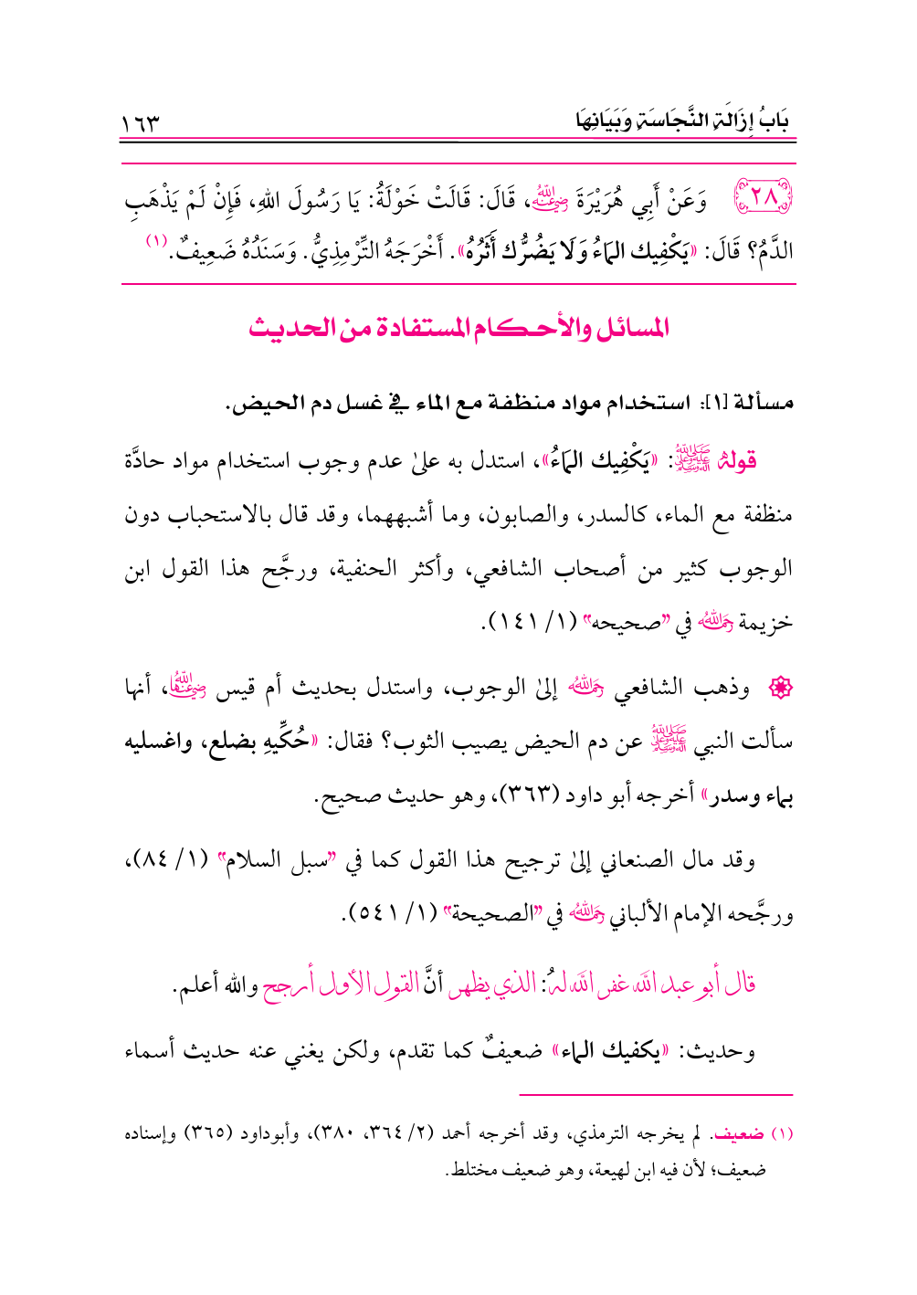 مسألة [١]: استخدام مواد منظفة مع الماء في غسل دم الحيض.
