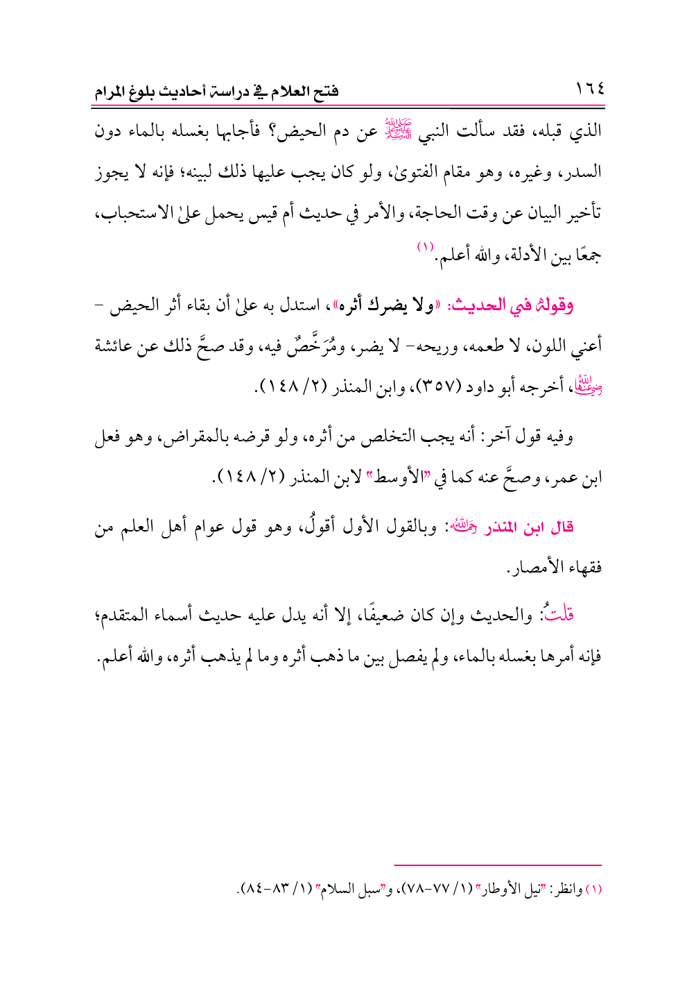 الذي قبله، فقد سألت النبي -صلى الله عليه وعلى آله وسلم- عن دم الحيض؟ فأجابها بغسله بالماء دون السدر، وغيره، وهو مقام الفتوى، ولو كان يجب عليها ذلك لبينه؛ فإنه لا يجوز تأخير البيان عن وقت الحاجة، والأمر في حديث أم قيس يحمل على الاستحباب، جمعًا بين الأدلة، والله أعلم. (¬١)