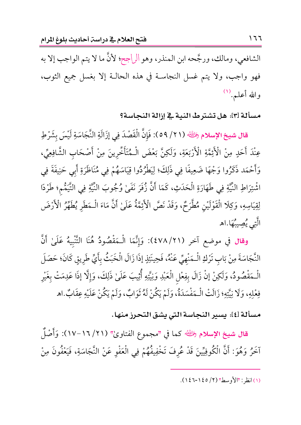 وقال في موضع آخر (٢١/ ٤٧٨): وَإِنَّمَا الْمَقْصُودُ هُنَا التَّنْبِيهُ عَلَى أَنَّ النَّجَاسَةَ مِنْ بَابِ تَرْكِ الْمَنْهِيِّ عَنْهُ، فَحِينَئِذٍ إذَا زَالَ الْخَبَثُ بِأَيِّ طَرِيقٍ كَانَ؛ حَصَلَ الْمَقْصُودُ، وَلَكِنْ إنْ زَالَ بِفِعْلِ الْعَبْدِ وَنِيَّتِهِ أُثِيبَ عَلَى ذَلِكَ، وَإِلَّا إذَا عَدِمَتْ بِغَيْرِ فِعْلِهِ، وَلَا نِيَّتِهِ؛ زَالَتْ الْمَفْسَدَةُ، وَلَمْ يَكُنْ لَهُ ثَوَابٌ، وَلَمْ يَكُنْ عَلَيْهِ عِقَابٌ. اهـ