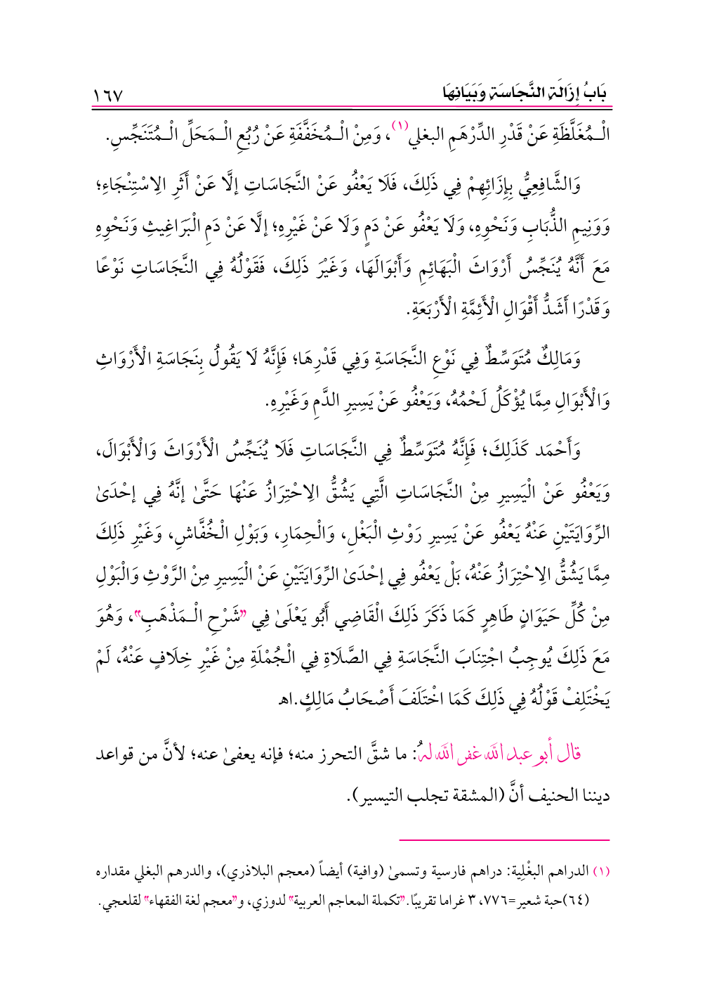 وَمَالِكٌ مُتَوَسِّطٌ فِي نَوْعِ النَّجَاسَةِ وَفِي قَدْرِهَا؛ فَإِنَّهُ لَا يَقُولُ بِنَجَاسَةِ الْأَرْوَاثِ وَالْأَبْوَالِ مِمَّا يُؤْكَلُ لَحْمُهُ، وَيَعْفُو عَنْ يَسِيرِ الدَّمِ وَغَيْرِهِ.