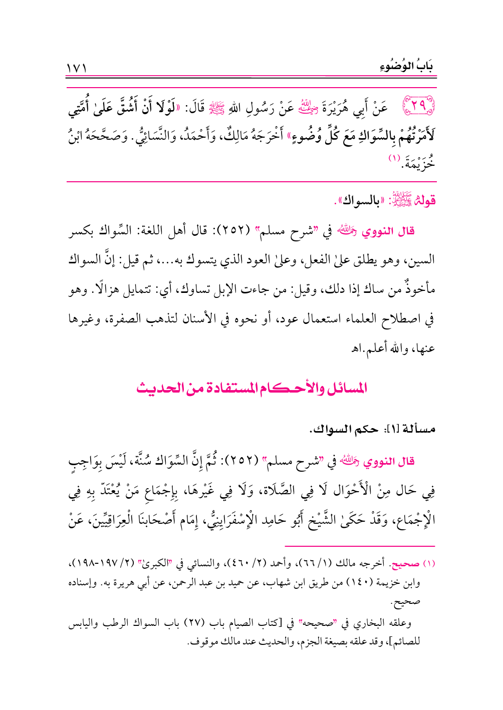 ٢٩ - عَنْ أَبِي هُرَيْرَةَ -رضي الله عنه- عَنْ رَسُولِ اللهِ - صلى الله عليه وسلم - قَالَ: «لَوْلَا أَنْ أَشُقَّ عَلَى أُمَّتِي لَأَمَرْتُهُمْ بِالسِّوَاكِ مَعَ كُلِّ وُضُوءٍ» أَخْرَجَهُ مَالِكٌ، وَأَحْمَدُ، وَالنَّسَائِيُّ. وَصَحَّحَهُ ابْنُ خُزَيْمَةَ. (¬١)