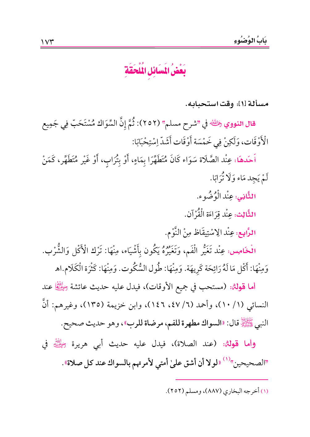 قال النووي -رحمه الله- في «شرح مسلم» (٢٥٢): ثُمَّ إِنَّ السِّوَاك مُسْتَحَبّ فِي جَمِيع الْأَوْقَات، وَلَكِنْ فِي خَمْسَة أَوْقَات أَشَدّ اِسْتِحْبَابًا: