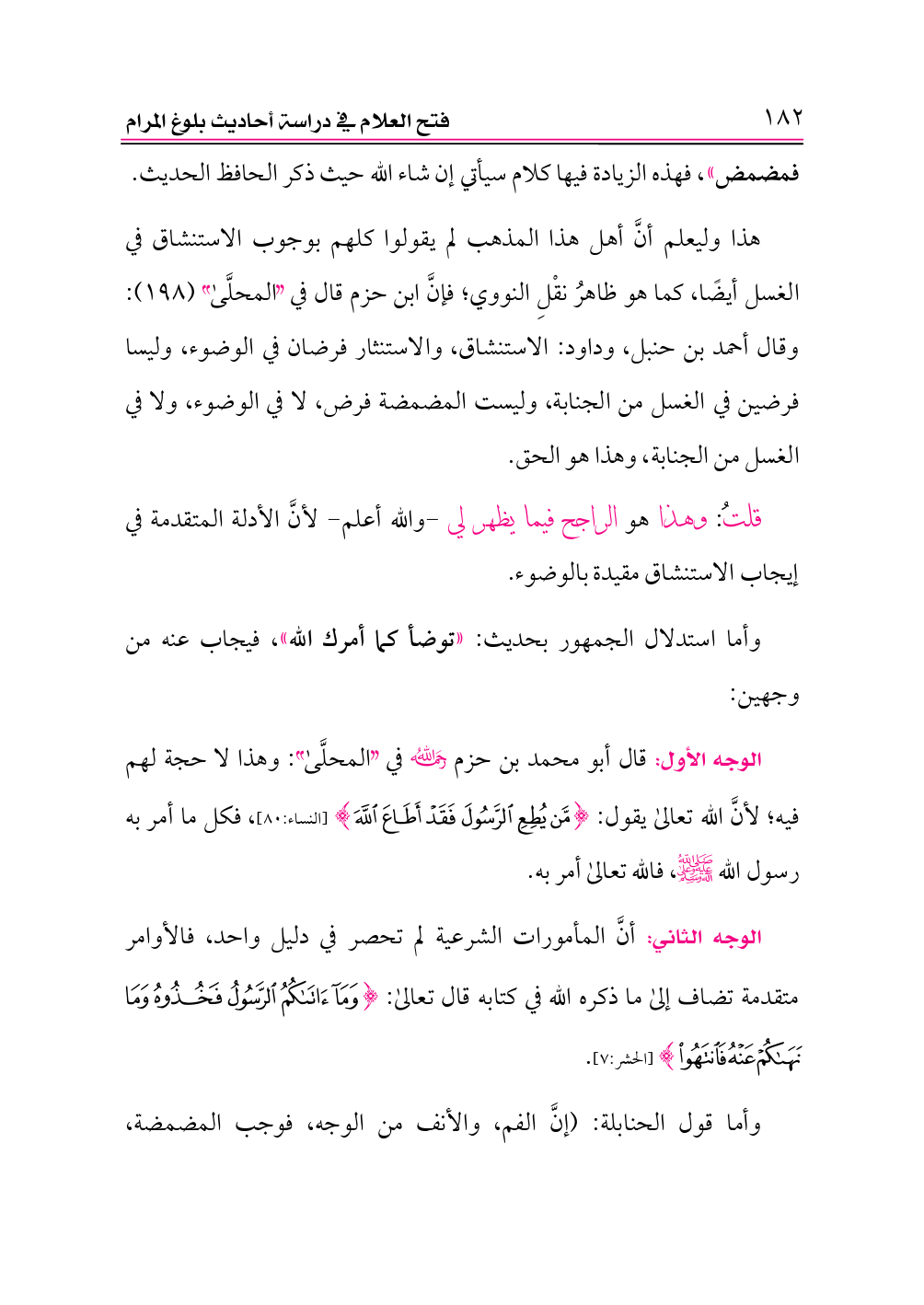 هذا وليعلم أنَّ أهل هذا المذهب لم يقولوا كلهم بوجوب الاستنشاق في الغسل أيضًا، كما هو ظاهرُ نقْلِ النووي؛ فإنَّ ابن حزم قال في «المحلَّى» (١٩٨): وقال أحمد بن حنبل، وداود: الاستنشاق، والاستنثار فرضان في الوضوء، وليسا فرضين في الغسل من الجنابة، وليست المضمضة فرض، لا في الوضوء، ولا في الغسل من الجنابة، وهذا هو الحق.