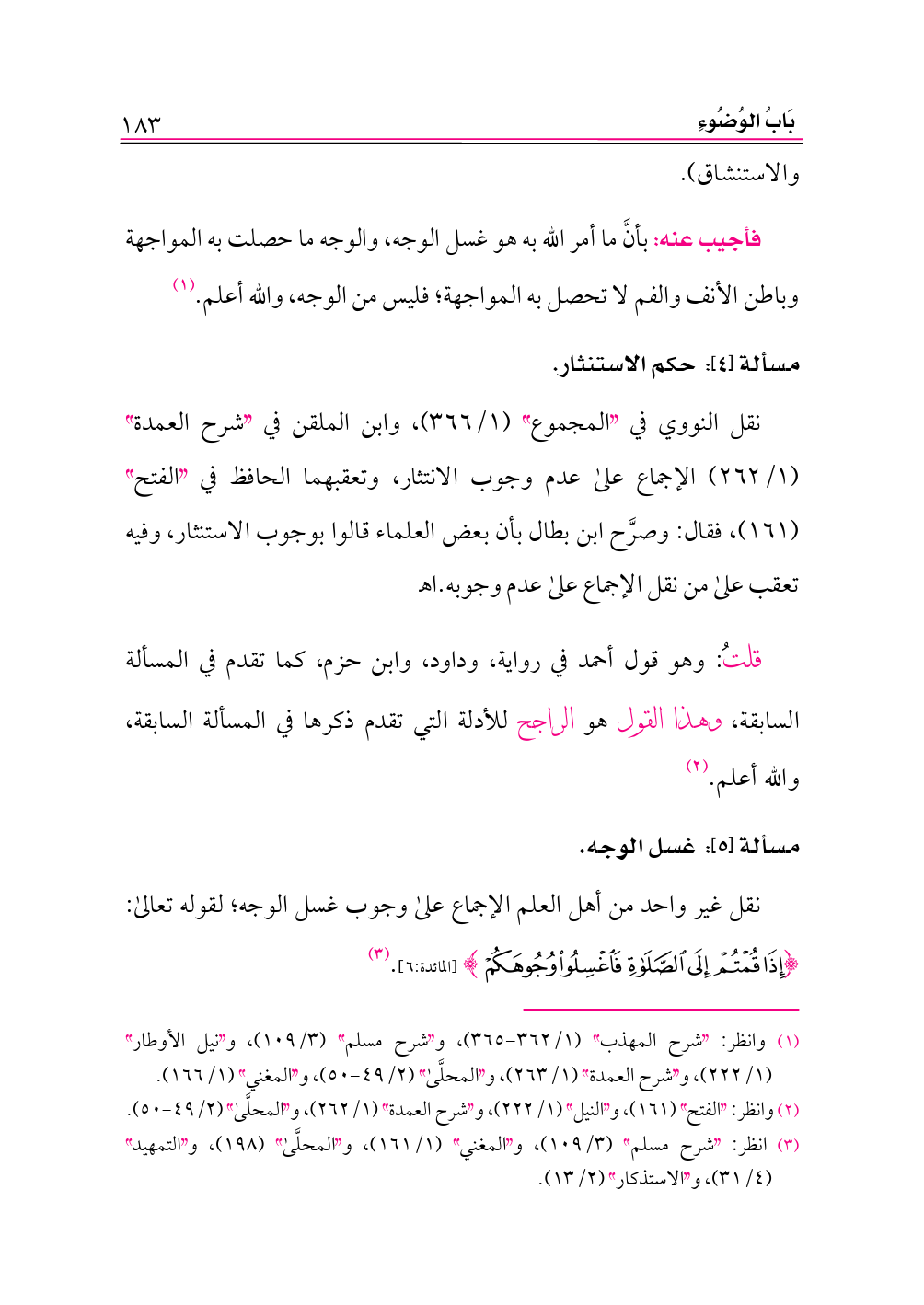 نقل النووي في «المجموع» (١/ ٣٦٦)، وابن الملقن في «شرح العمدة» (١/ ٢٦٢) الإجماع على عدم وجوب الانتثار، وتعقبهما الحافظ في «الفتح» (١٦١)، فقال: وصرَّح ابن بطال بأن بعض العلماء قالوا بوجوب الاستنثار، وفيه تعقب على من نقل الإجماع على عدم وجوبه. اهـ