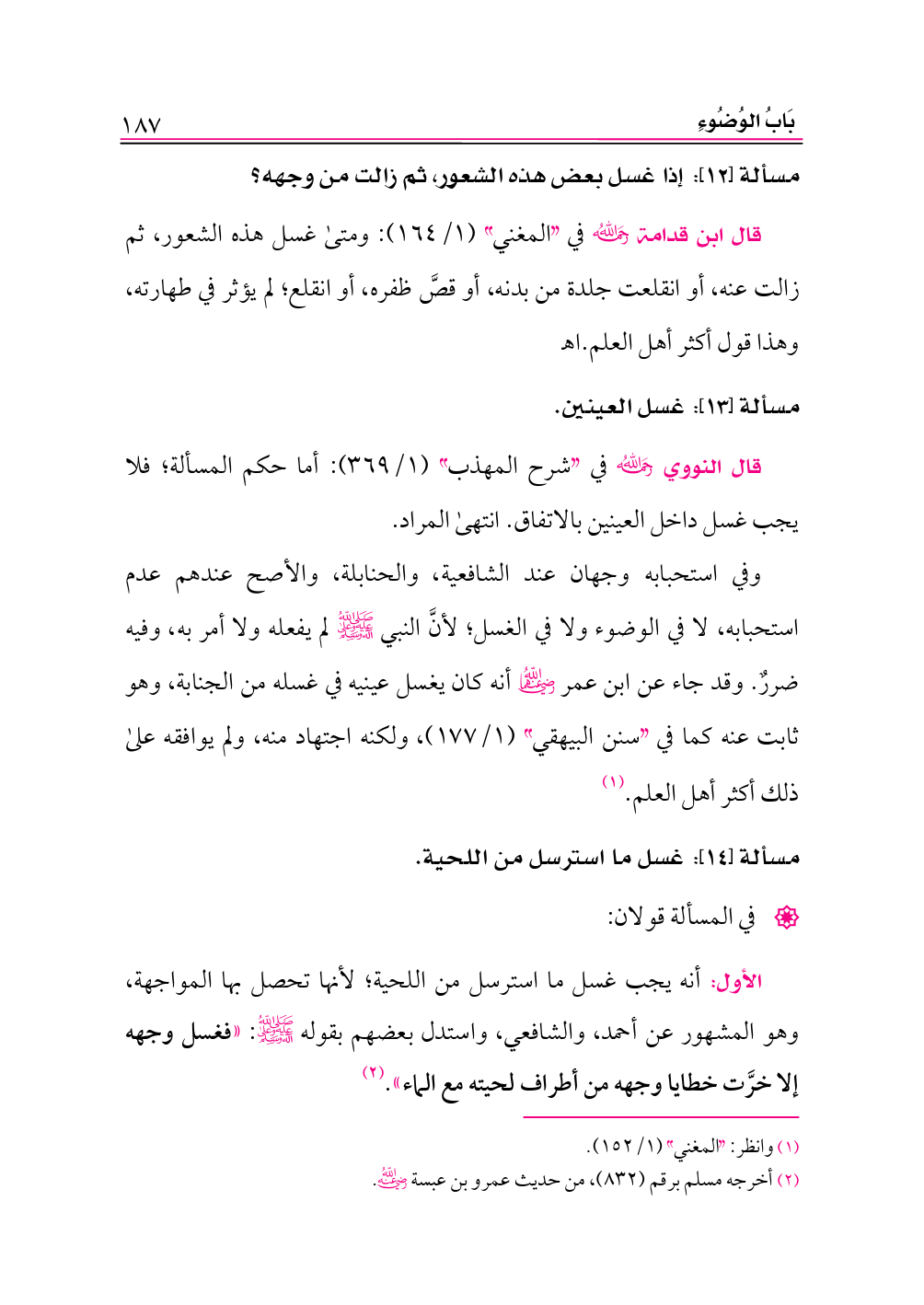 الأول: أنه يجب غسل ما استرسل من اللحية؛ لأنها تحصل بها المواجهة، وهو المشهور عن أحمد، والشافعي، واستدل بعضهم بقوله -صلى الله عليه وعلى آله وسلم-: «فغسل وجهه إلا خرَّت خطايا وجهه من أطراف لحيته مع الماء». (¬٢)