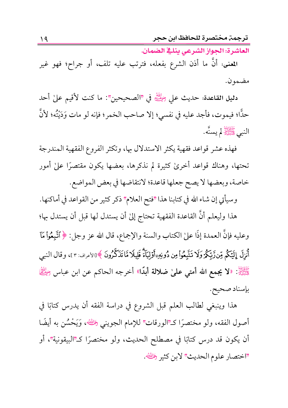 هذا وليعلم أنَّ القاعدة الفقهية تحتاج إلى أن يستدل لها قبل أن يستدل بها؛ وعليه فإنَّ العمدة إذًا على الكتاب والسنة والإجماع، قال الله عز وجل: {اتَّبِعُوا مَا أُنْزِلَ إِلَيْكُمْ مِنْ رَبِّكُمْ وَلَا تَتَّبِعُوا مِنْ دُونِهِ أَوْلِيَاءَ قَلِيلًا مَا تَذَكَّرُونَ} [الأعراف: ٣]، وقال النبي -صلى الله عليه وعلى آله وسلم-: «لا يجمع الله أمتي على ضلالة أبدًا» أخرجه الحاكم عن ابن عباس -رضي الله عنهما- بإسناد صحيح.