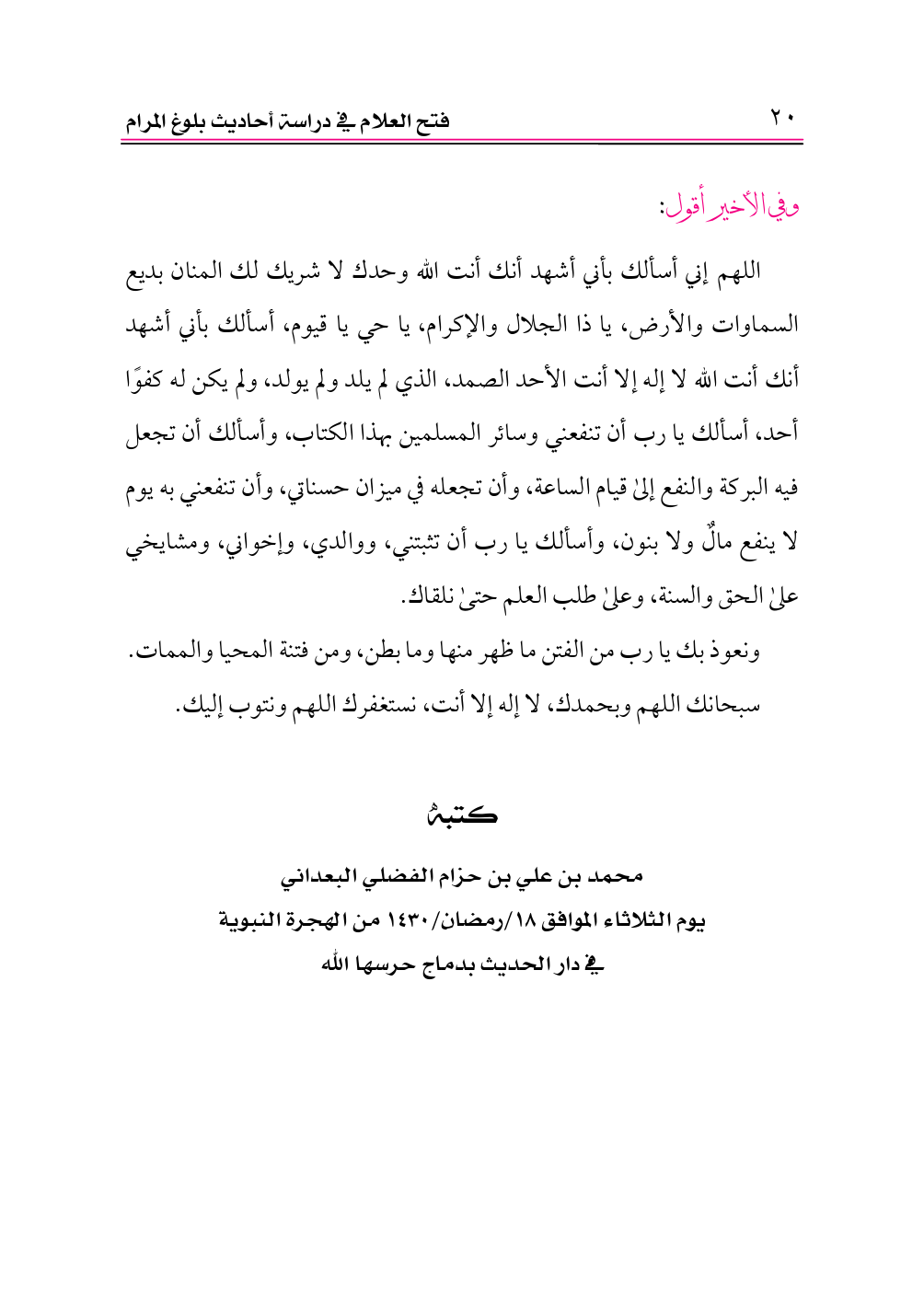 اللهم إني أسألك بأني أشهد أنك أنت الله وحدك لا شريك لك المنان بديع السماوات والأرض، يا ذا الجلال والإكرام، يا حي يا قيوم، أسألك بأني أشهد أنك أنت الله لا إله إلا أنت الأحد الصمد، الذي لم يلد ولم يولد، ولم يكن له كفوًا أحد، أسألك يا رب أن تنفعني وسائر المسلمين بهذا الكتاب، وأسألك أن تجعل فيه البركة والنفع إلى قيام الساعة، وأن تجعله في ميزان حسناتي، وأن تنفعني به يوم لا ينفع مالٌ ولا بنون، وأسألك يا رب أن تثبتني، ووالدي، وإخواني، ومشايخي على الحق والسنة، وعلى طلب العلم حتى نلقاك.