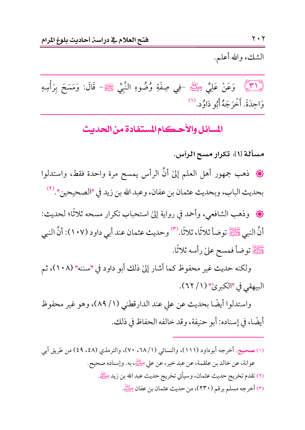 ٣١ - وَعَنْ عَلِيٍّ -رضي الله عنه- -فِي صِفَةِ وُضُوءِ النَّبِيِّ - صلى الله عليه وسلم - قَالَ: وَمَسَحَ بِرَأْسِهِ وَاحِدَةً. أَخْرَجَهُ أَبُو دَاوُد. (¬١)