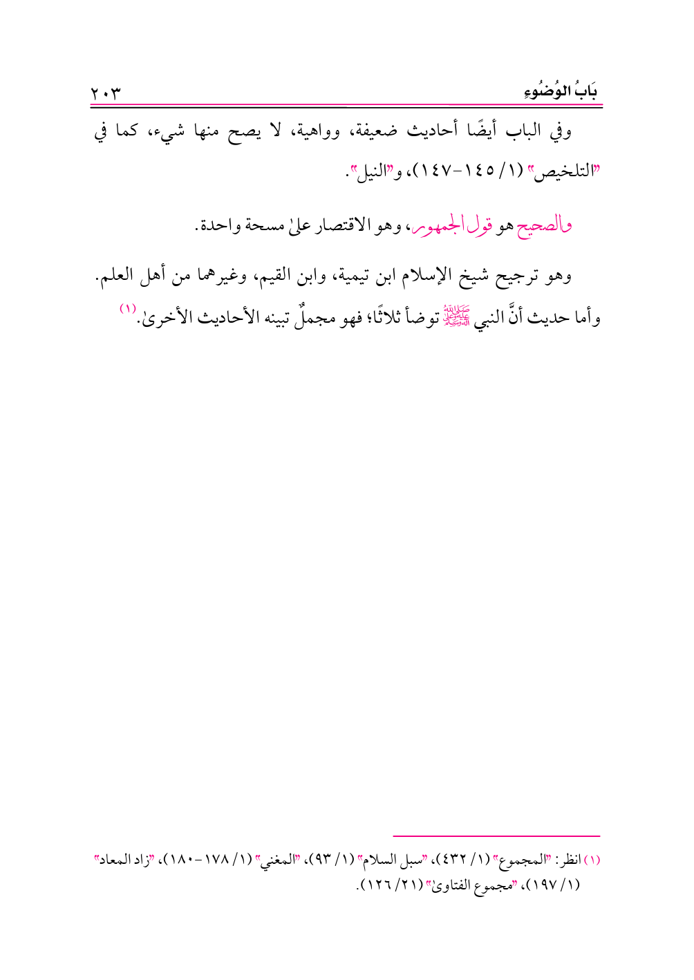 (¬١) انظر: «المجموع» (١/ ٤٣٢)، «سبل السلام» (١/ ٩٣)، «المغني» (١/ ١٧٨ - ١٨٠)، «زاد المعاد» (١/ ١٩٧)، «مجموع الفتاوى» (٢١/ ١٢٦).