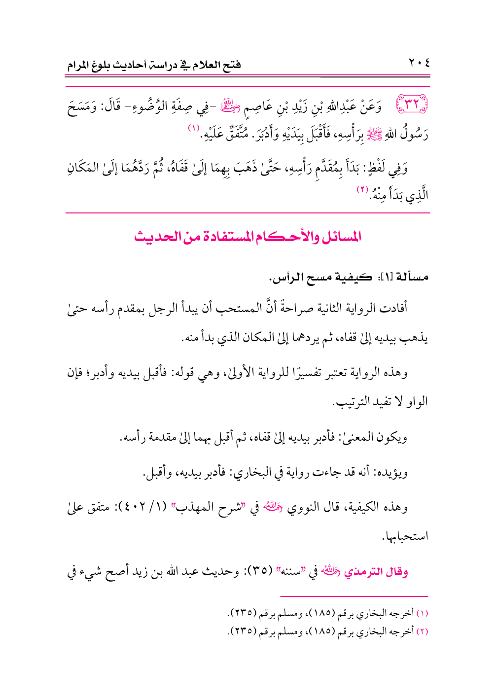 ٣٢ - وَعَنْ عَبْدِاللهِ بْنِ زَيْدِ بْنِ عَاصِمٍ -رضي الله عنهما- -فِي صِفَةِ الوُضُوءِ- قَالَ: وَمَسَحَ رَسُولُ اللهِ - صلى الله عليه وسلم - بِرَأْسِهِ، فَأَقْبَلَ بِيَدَيْهِ وَأَدْبَرَ. مُتَّفَقٌ عَلَيْهِ. (¬١)