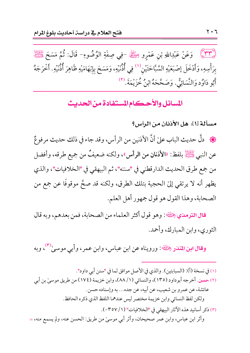 ٣٣ - وَعَنْ عَبْدِاللهِ بْنِ عَمْرٍو -رضي الله عنهما- -فِي صِفَةِ الوُضُوءِ- قَالَ: ثُمَّ مَسَحَ -صلى الله عليه وعلى آله وسلم- بِرَأْسِهِ، وَأَدْخَلَ إصْبَعَيْهِ السَّبَّاحَتَيْنِ (¬١) فِي أُذُنَيْهِ، وَمَسَحَ بِإِبْهَامَيْهِ ظَاهِرَ أُذُنَيْهِ. أَخْرَجَهُ أَبُو دَاوُد وَالنَّسَائِيُّ. وَصَحَّحَهُ ابْنُ خُزَيْمَةَ. (¬٢)
