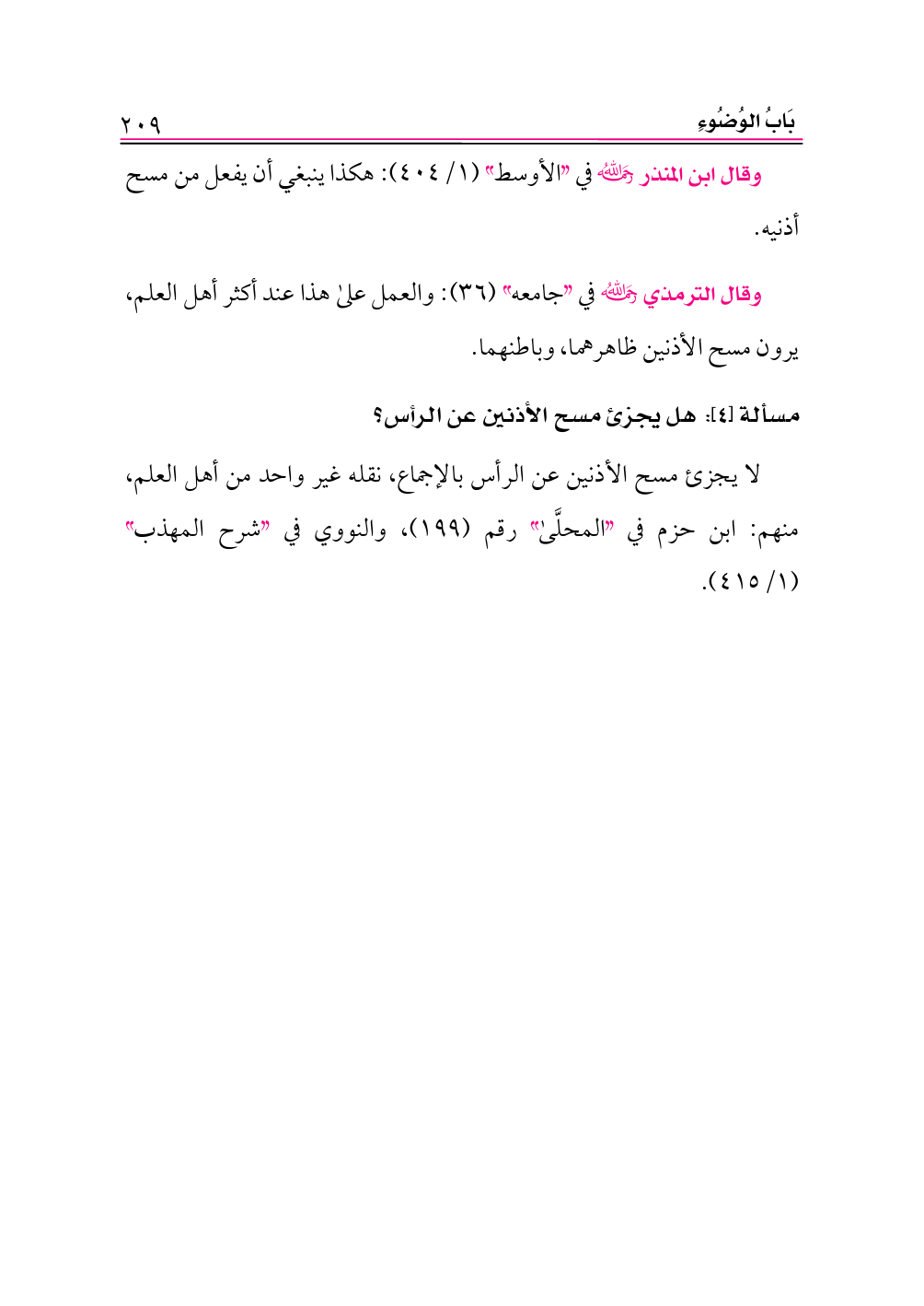 وقال ابن المنذر -رحمه الله- في «الأوسط» (١/ ٤٠٤): هكذا ينبغي أن يفعل من مسح أذنيه.