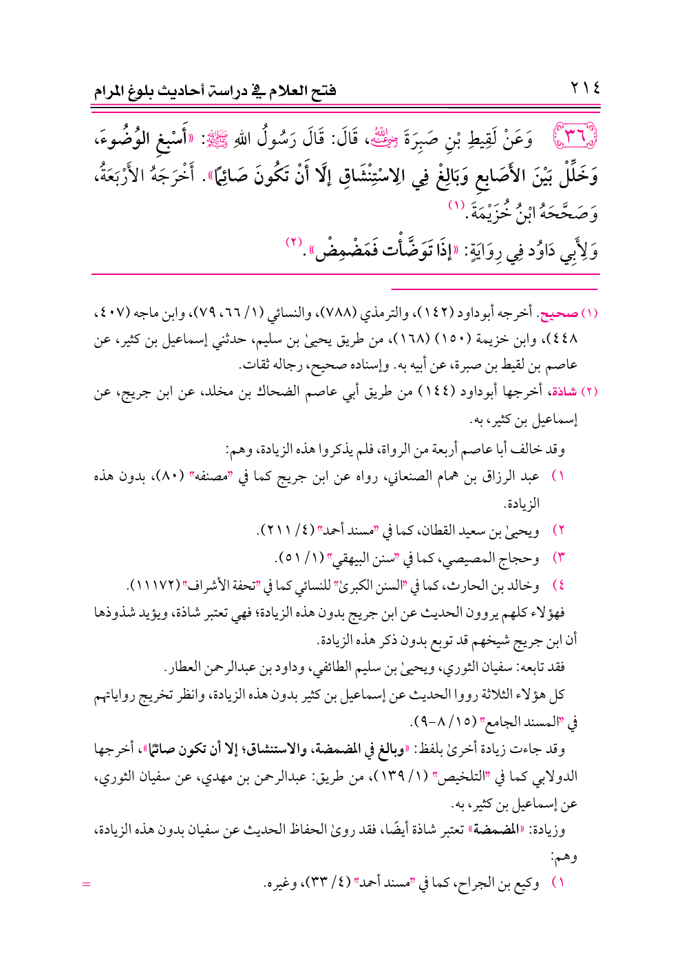 ٣٦ - وَعَنْ لَقِيطِ بْنِ صَبِرَةَ -رضي الله عنه-، قَالَ: قَالَ رَسُولُ اللهِ - صلى الله عليه وسلم -: «أَسْبِغِ الوُضُوءَ، وَخَلِّلْ بَيْنَ الأَصَابِعِ وَبَالِغْ فِي الِاسْتِنْشَاقِ إلَّا أَنْ تَكُونَ صَائِمًا». أَخْرَجَهُ الأَرْبَعَةُ، وَصَحَّحَهُ ابْنُ خُزَيْمَةَ. (¬١)
