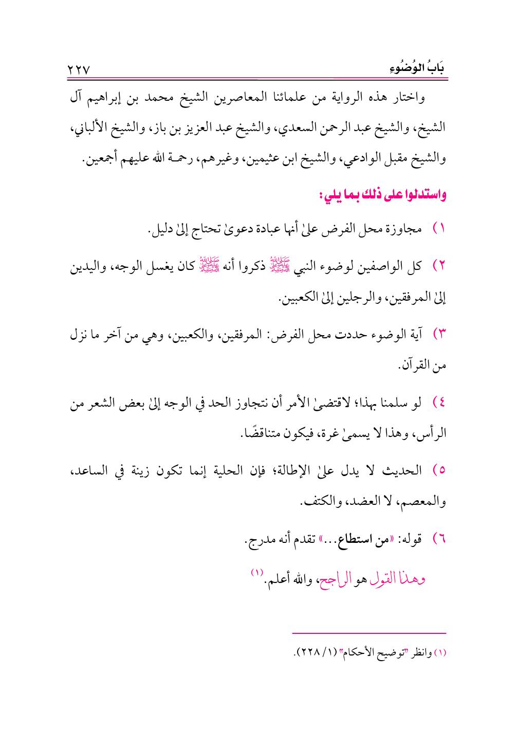 ٢) كل الواصفين لوضوء النبي -صلى الله عليه وعلى آله وسلم- ذكروا أنه -صلى الله عليه وعلى آله وسلم- كان يغسل الوجه، واليدين إلى المرفقين، والرجلين إلى الكعبين.