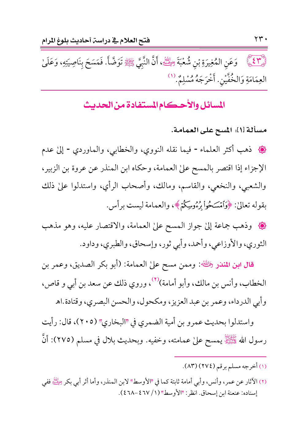 ٤٣ - وَعَنِ المُغِيرَةِ بْنِ شُعْبَةَ -رضي الله عنه-، أَنَّ النَّبِيَّ - صلى الله عليه وسلم - تَوَضَّأَ. فَمَسَحَ بِنَاصِيَتِهِ، وَعَلَى العِمَامَةِ وَالخُفَّيْنِ. أَخْرَجَهُ مُسْلِمٌ. (¬١)