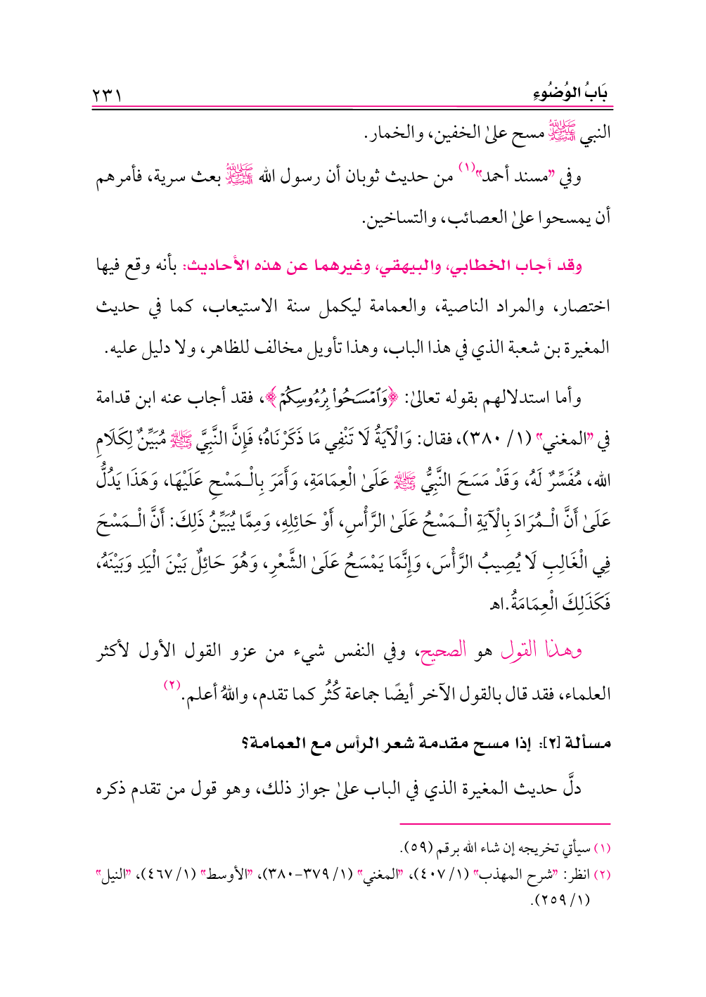 وأما استدلالهم بقوله تعالى: {وَامْسَحُوا بِرُءُوسِكُمْ}، فقد أجاب عنه ابن قدامة في «المغني» (١/ ٣٨٠)، فقال: وَالْآيَةُ لَا تَنْفِي مَا ذَكَرْنَاهُ؛ فَإِنَّ النَّبِيَّ - صلى الله عليه وسلم - مُبَيِّنٌ لِكَلَامِ الله، مُفَسِّرٌ لَهُ، وَقَدْ مَسَحَ النَّبِيُّ - صلى الله عليه وسلم - عَلَى الْعِمَامَةِ، وَأَمَرَ بِالْمَسْحِ عَلَيْهَا، وَهَذَا يَدُلُّ عَلَى أَنَّ الْمُرَادَ بِالْآيَةِ الْمَسْحُ عَلَى الرَّأْسِ، أَوْ حَائِلِهِ، وَمِمَّا يُبَيِّنُ ذَلِكَ: أَنَّ الْمَسْحَ فِي الْغَالِبِ لَا يُصِيبُ الرَّأْسَ، وَإِنَّمَا يَمْسَحُ عَلَى الشَّعْرِ، وَهُوَ حَائِلٌ بَيْنَ الْيَدِ وَبَيْنَهُ، فَكَذَلِكَ الْعِمَامَةُ. اهـ