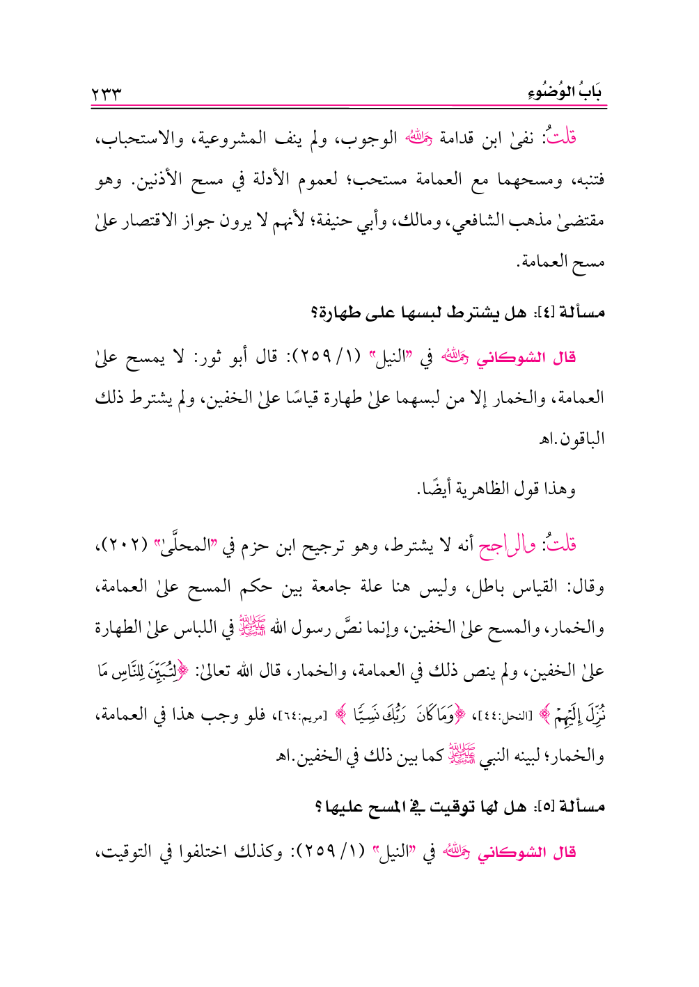 قلتُ: نفى ابن قدامة -رحمه الله- الوجوب، ولم ينف المشروعية، والاستحباب، فتنبه، ومسحهما مع العمامة مستحب؛ لعموم الأدلة في مسح الأذنين. وهو مقتضى مذهب الشافعي، ومالك، وأبي حنيفة؛ لأنهم لا يرون جواز الاقتصار على مسح العمامة.