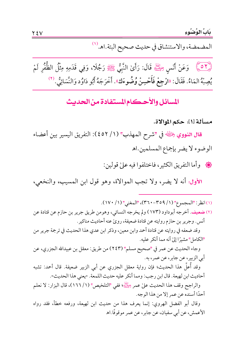 ٥٢ - وَعَنْ أَنَسٍ -رضي الله عنه- قَالَ: رَأَى النَّبِيُّ - صلى الله عليه وسلم - رَجُلًا، وَفِي قَدَمِهِ مِثْلُ الظُّفُرِ لَمْ يُصِبْهُ المَاءُ. فَقَالَ: «ارْجِعْ فَأَحْسِنْ وُضُوءَك». أَخْرَجَهُ أَبُو دَاوُد وَالنَّسَائِيُّ. (¬٢)