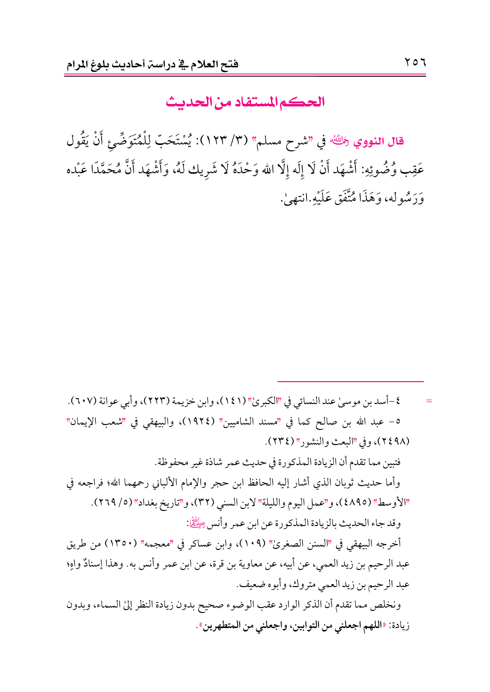 قال النووي -رحمه الله- في «شرح مسلم» (٣/ ١٢٣): يُسْتَحَبّ لِلْمُتَوَضِّئِ أَنْ يَقُول عَقِب وُضُوئِهِ: أَشْهَد أَنْ لَا إِلَه إِلَّا الله وَحْدَهُ لَا شَرِيك لَهُ، وَأَشْهَد أَنَّ مُحَمَّدًا عَبْده وَرَسُوله، وَهَذَا مُتَّفَق عَلَيْهِ. انتهى.