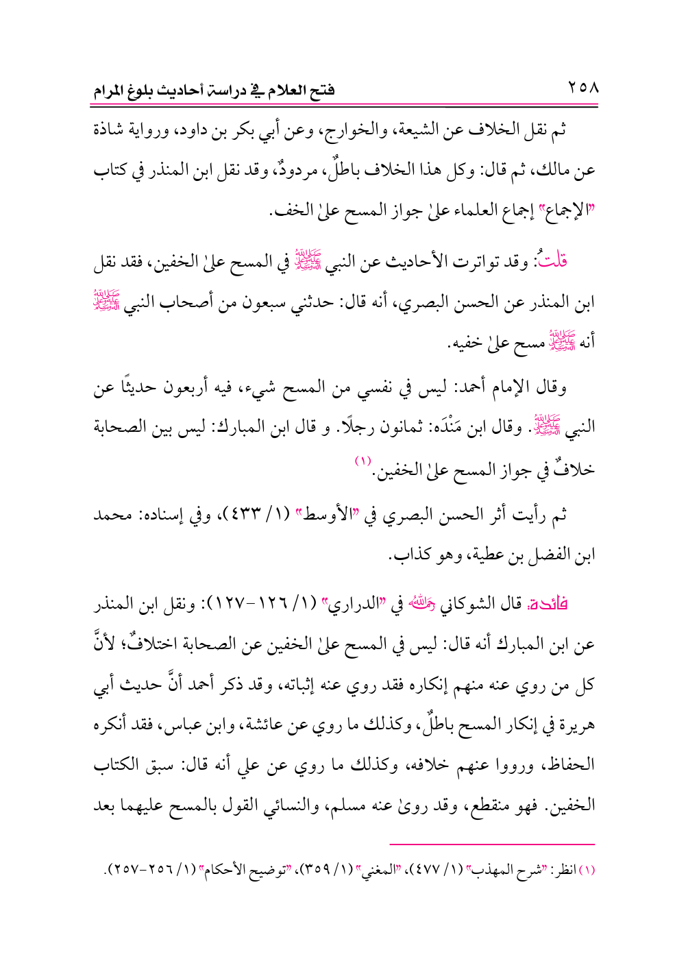 فائدة: قال الشوكاني -رحمه الله- في «الدراري» (١/ ١٢٦ - ١٢٧): ونقل ابن المنذر عن ابن المبارك أنه قال: ليس في المسح على الخفين عن الصحابة اختلافٌ؛ لأنَّ كل من روي عنه منهم إنكاره فقد روي عنه إثباته، وقد ذكر أحمد أنَّ حديث أبي هريرة في إنكار المسح باطلٌ، وكذلك ما روي عن عائشة، وابن عباس، فقد أنكره الحفاظ، ورووا عنهم خلافه، وكذلك ما روي عن علي أنه قال: سبق الكتاب الخفين. فهو منقطع، وقد روى عنه مسلم، والنسائي القول بالمسح عليهما بعد