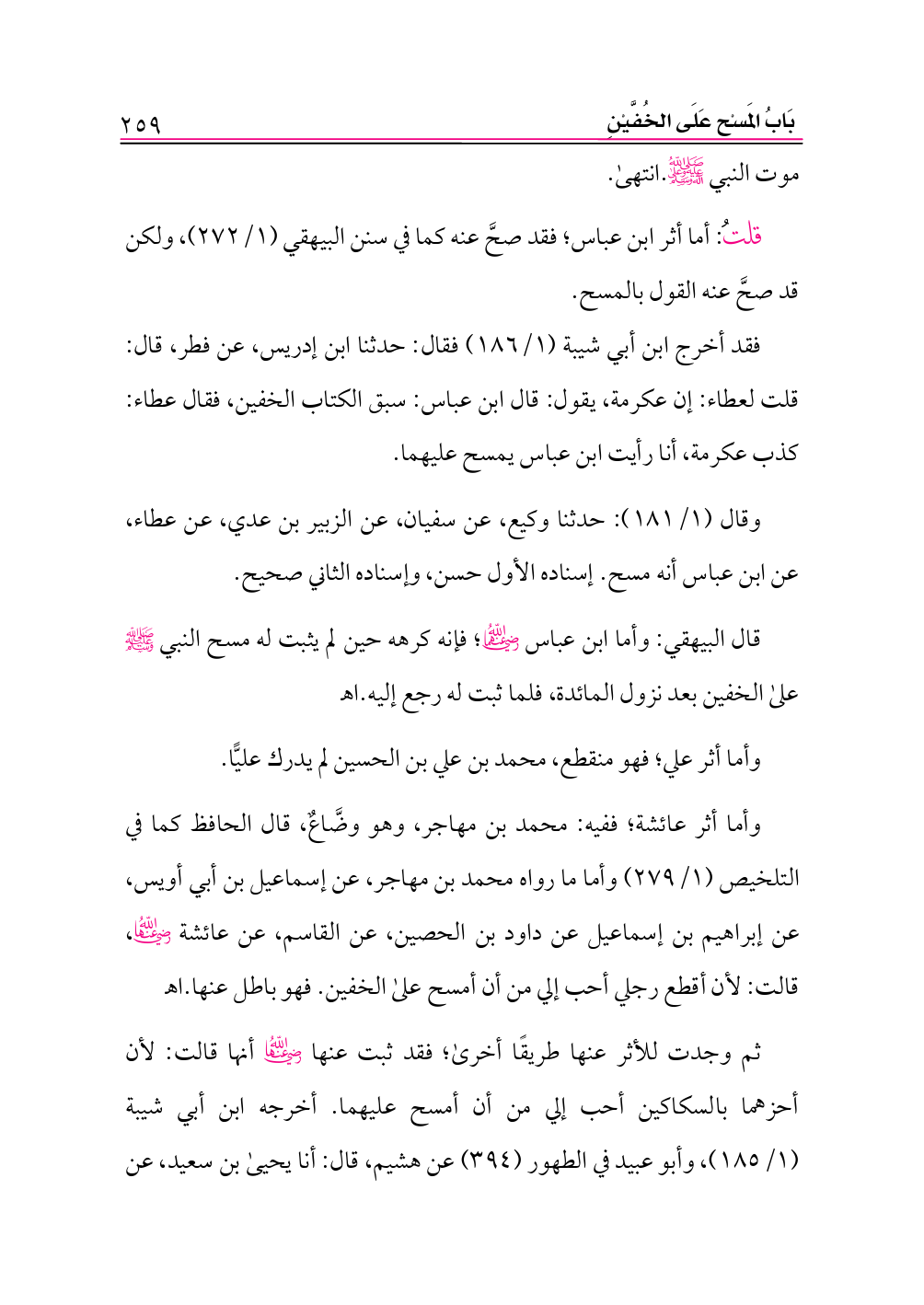 قلتُ: أما أثر ابن عباس؛ فقد صحَّ عنه كما في سنن البيهقي (١/ ٢٧٢)، ولكن قد صحَّ عنه القول بالمسح.