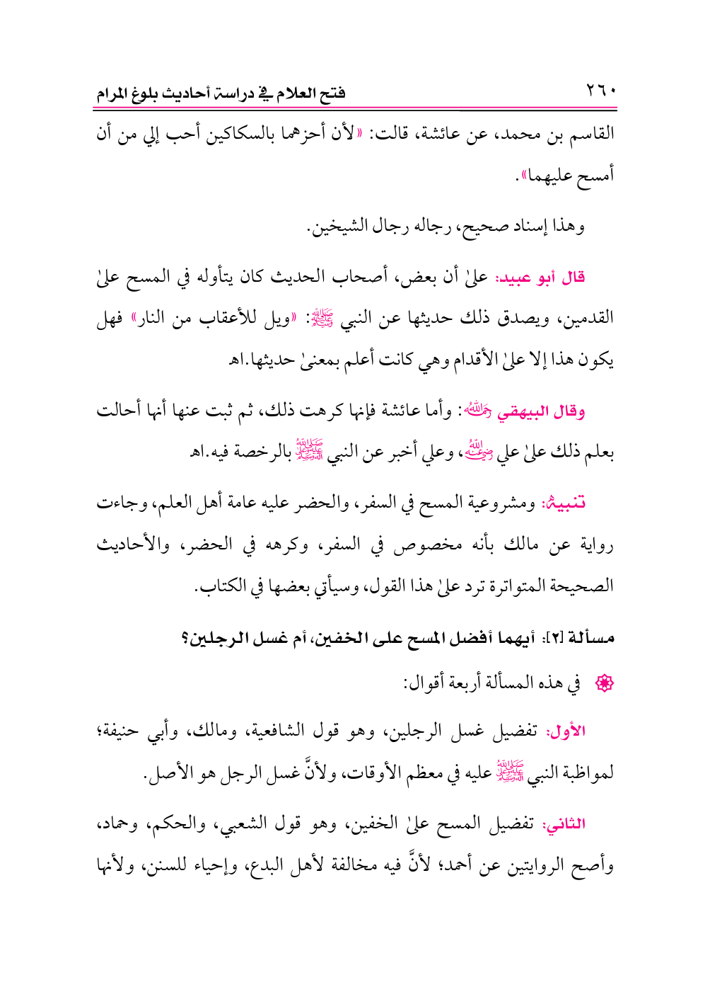 تنبيه: ومشروعية المسح في السفر، والحضر عليه عامة أهل العلم، وجاءت رواية عن مالك بأنه مخصوص في السفر، وكرهه في الحضر، والأحاديث الصحيحة المتواترة ترد على هذا القول، وسيأتي بعضها في الكتاب.