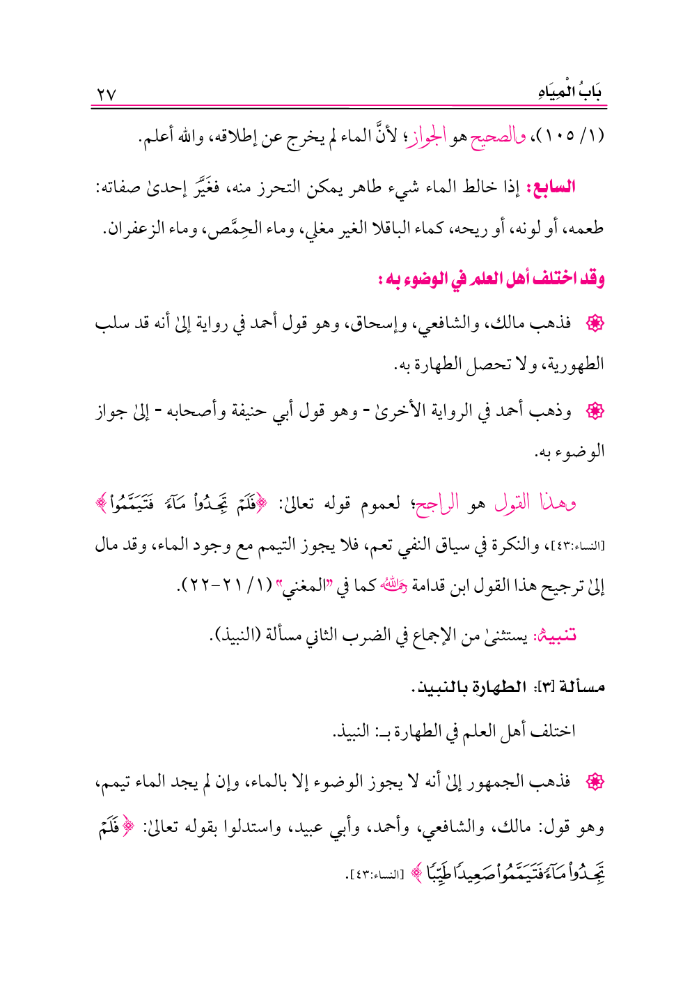 (١/ ١٠٥)، والصحيح هو الجواز؛ لأنَّ الماء لم يخرج عن إطلاقه، والله أعلم.
