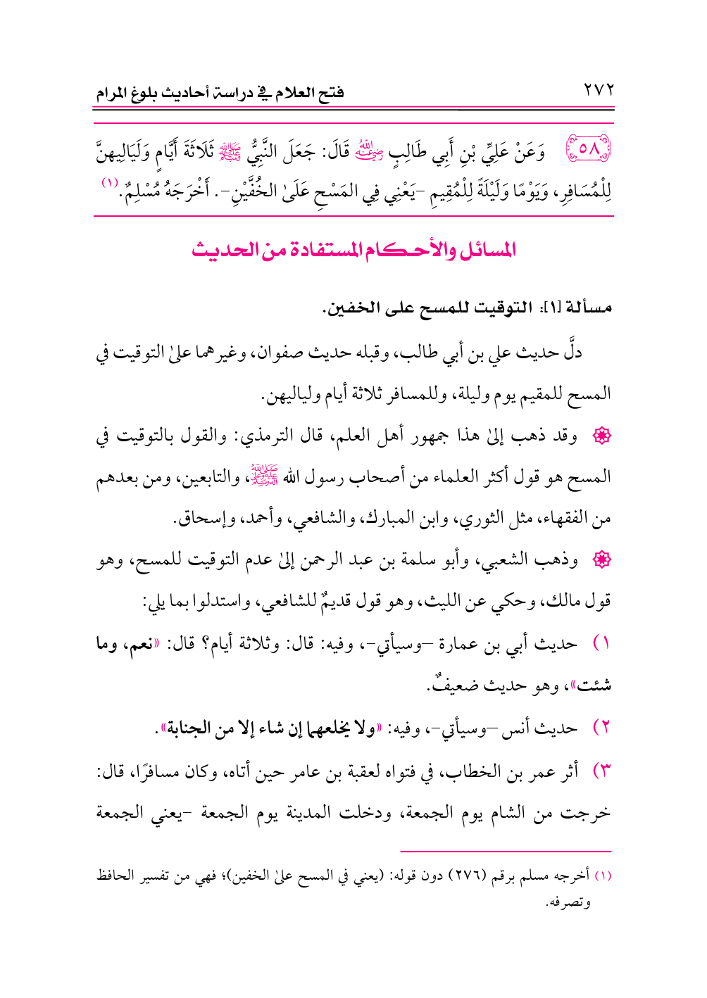 ٥٨ - وَعَنْ عَلِيِّ بْنِ أَبِي طَالِبٍ -رضي الله عنه- قَالَ: جَعَلَ النَّبِيُّ - صلى الله عليه وسلم - ثَلَاثَةَ أَيَّامٍ وَلَيَالِيهنَّ لِلْمُسَافِرِ، وَيَوْمًا وَلَيْلَةً لِلْمُقِيمِ -يَعْنِي فِي المَسْحِ عَلَى الخُفَّيْنِ-. أَخْرَجَهُ مُسْلِمٌ. (¬١)