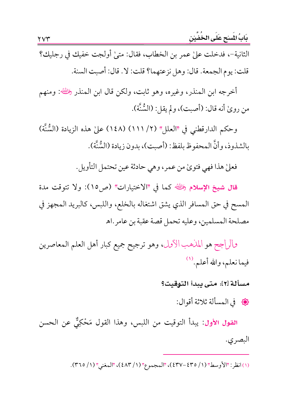 الثانية-، فدخلت على عمر بن الخطاب، فقال: متى أولجت خفيك في رجليك؟ قلت: يوم الجمعة. قال: وهل نزعتهما؟ قلت: لا. قال: أصبت السنة.