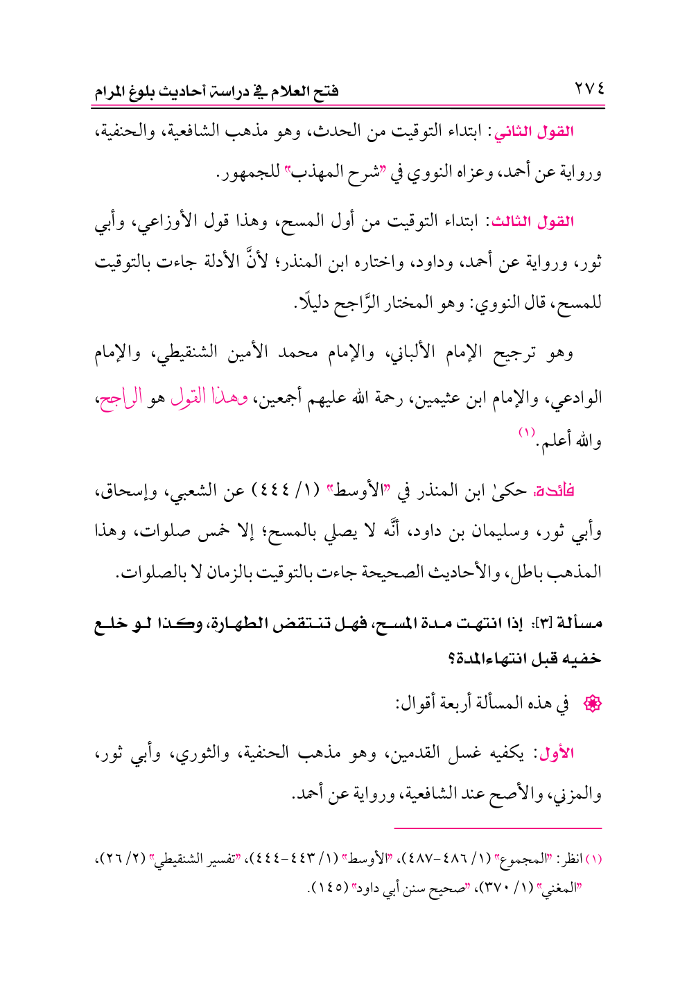 القول الثالث: ابتداء التوقيت من أول المسح، وهذا قول الأوزاعي، وأبي ثور، ورواية عن أحمد، وداود، واختاره ابن المنذر؛ لأنَّ الأدلة جاءت بالتوقيت للمسح، قال النووي: وهو المختار الرَّاجح دليلًا.